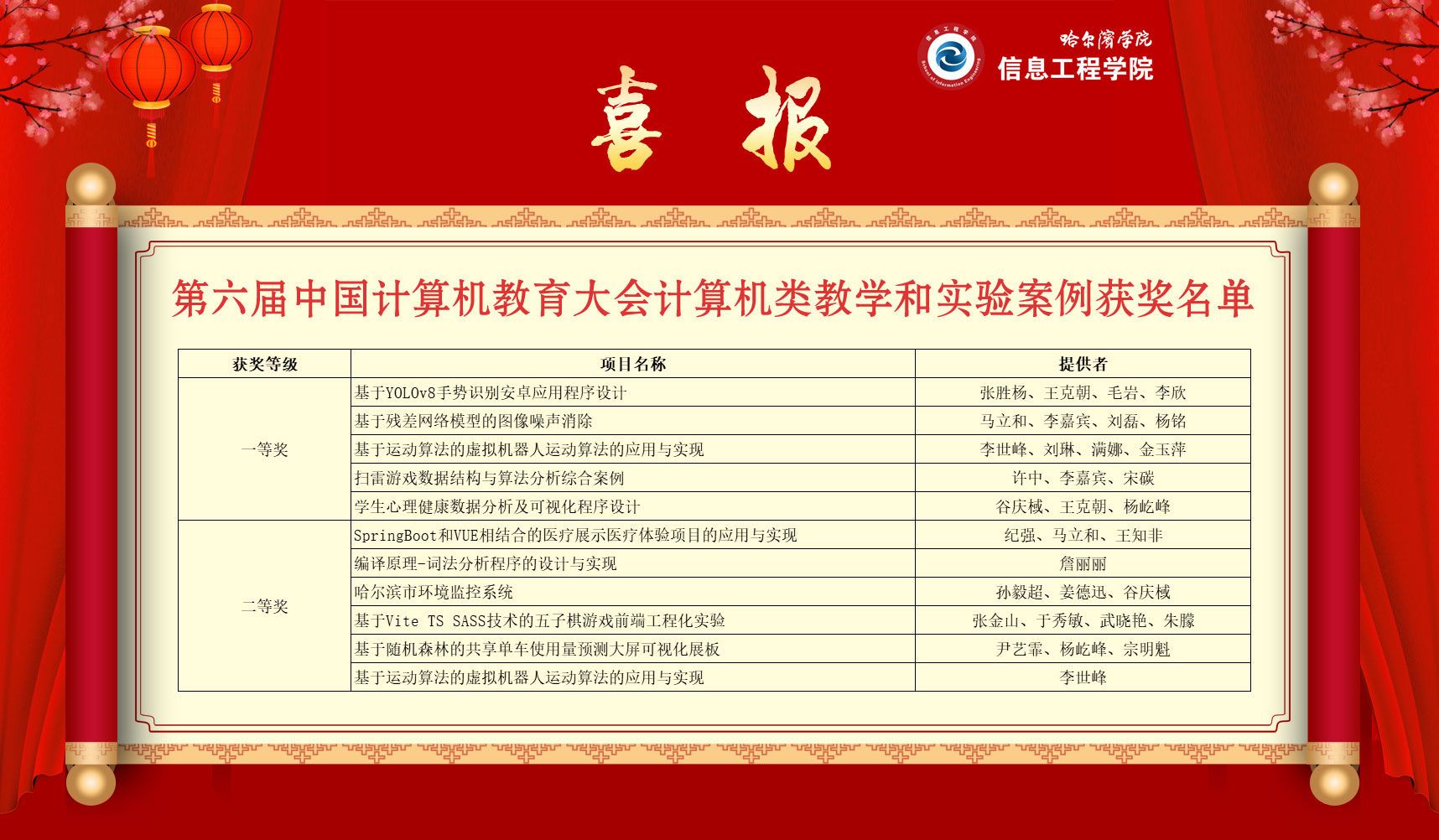 在教育部高等学校计算机类专业教学指导委员会和全国高等学校计算机教学与产业实践资源建设专家委员会组织的第六届中国计算机教育大会计算机类教学资源建设优秀教学案例评选中,信息工程学院与东软、海康等合作企业共同开发的案例作品共11项获奖,其中一等奖5项、二等奖6项。