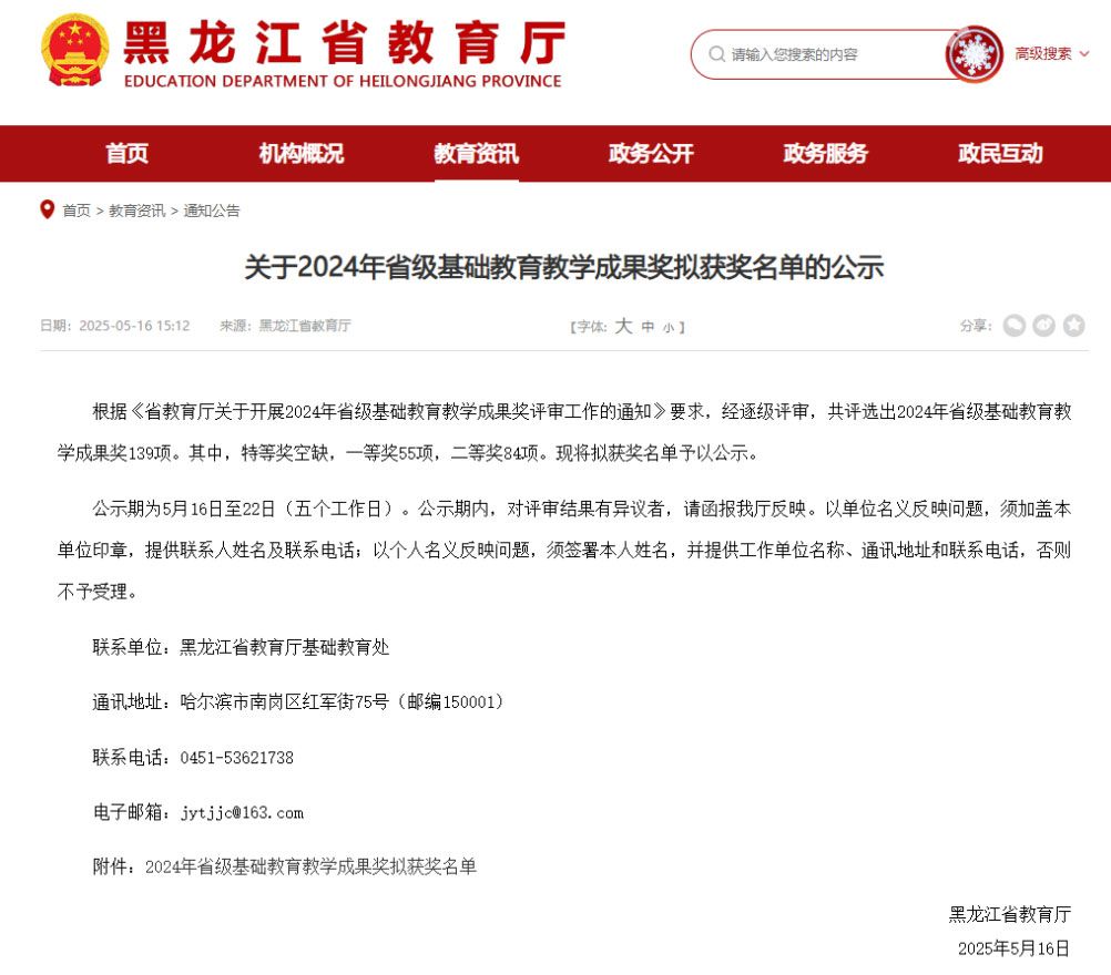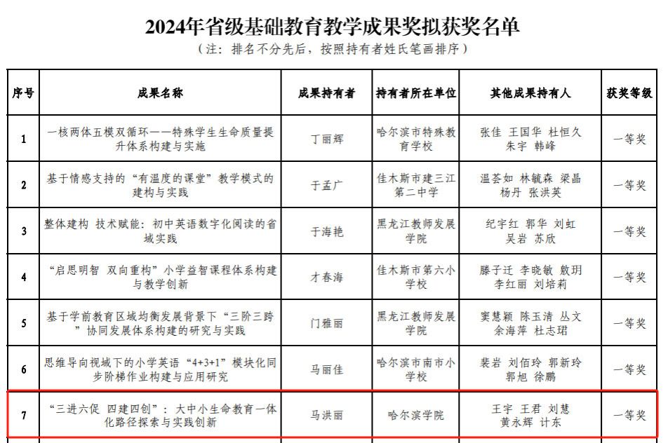 近日,2024年度黑龙江省基础教育教学成果奖评选结果揭晓,我院数学师范专业教师团队与实习基地哈尔滨市第十七中学校联合申报的《三进六促 四创四建:大中小生命教育一体化路径探索与实践创新》喜获一等奖,实现了我院数学师范教育专业建设发展的新突破。