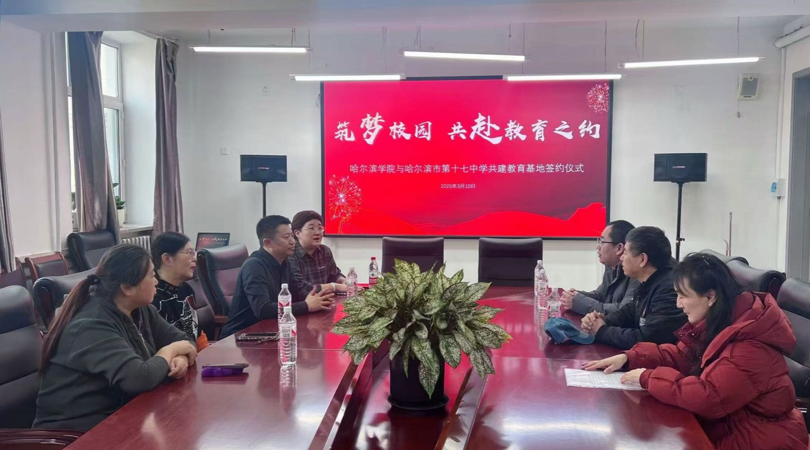 (文/王君)2025年3月10日,哈尔滨学院与哈尔滨市第十七中学在十七中学民益校区隆重举行实习基地共建签约仪式。此次合作标志着双方在教育领域的深度携手,旨在为高校学生提供实践锻炼平台,同时助力中学教育的高质量发展。出席本次签约仪式的有哈尔滨学院信息工程学院副院长苑成军、数学系主任计东和数学系教法教研室主任王君以及哈尔滨市第十七中学王宇校长、张宁主任、李蓓蕾老师和李葆华老师。