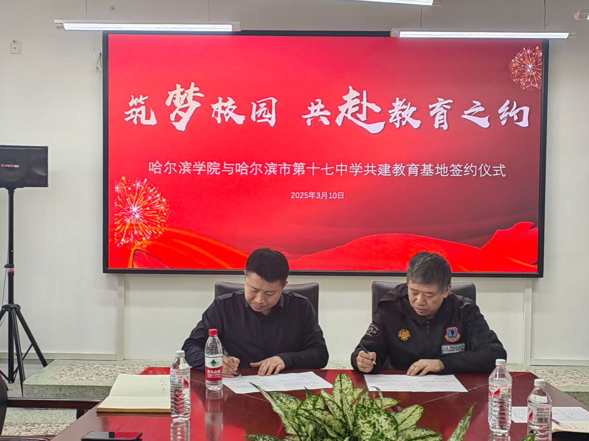 在与会人员的共同见证下,哈尔滨市第十七中学王宇校长与哈尔滨学院信息工程学院副院长苑成军院长郑重签署了教育实习基地共建协议。这标志着双方在教育领域的深度合作正式开启,为高校学生提供了实践锻炼的优质平台,也为中学教育注入了新的活力与资源。