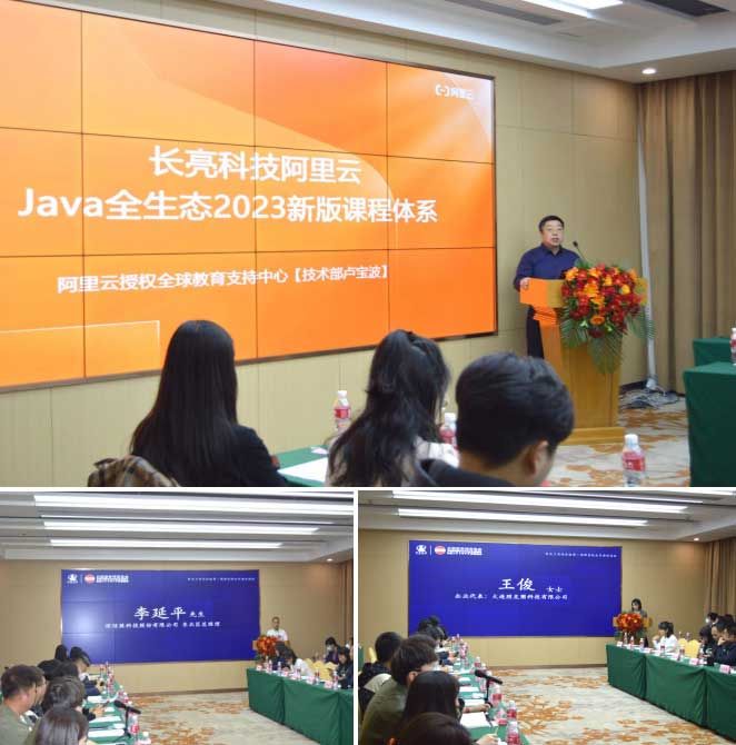 四、长亮科技技术副总卢宝波就2023年师资培训及新课程体系发布进行介绍。深信服李延平女士就国家网络安全产教融合实施进行报告。大连朋友圈科技有限公司的人事总监王俊、大连亿达信息技术有限公司招聘经理李明洋和大连必捷必信息技术有限公司招聘总监颜旭三位对自己的公司和用人需求进行简单汇报。