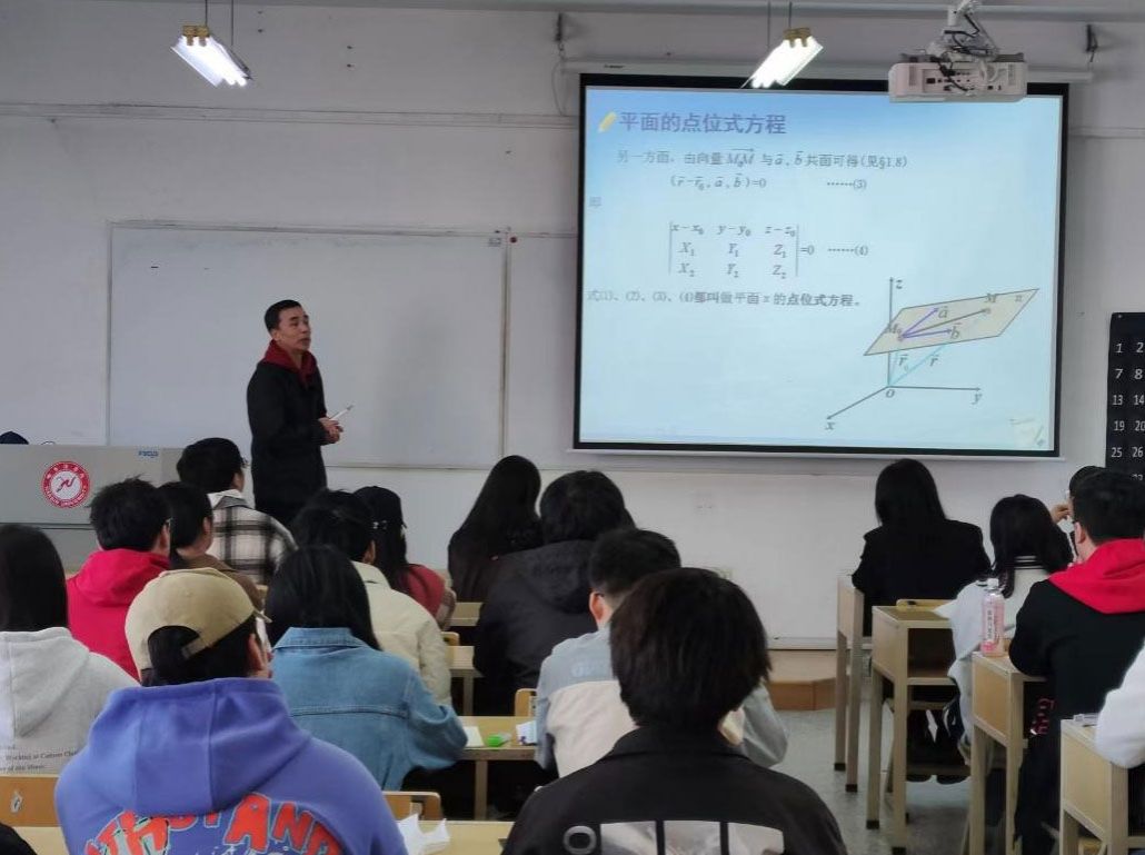 宋士波老师示范交流的是《空间解析几何》课程中平面的方程一节课,课上宋老师先从整体上介绍了平面与直线这一章要研究的内容和逻辑关系,让学生整体把握平面与直线一章在课程中的地位。教学过程中处处渗透几何思想和数学推理的思考,整堂课处处体现课程思政,润物细无声。