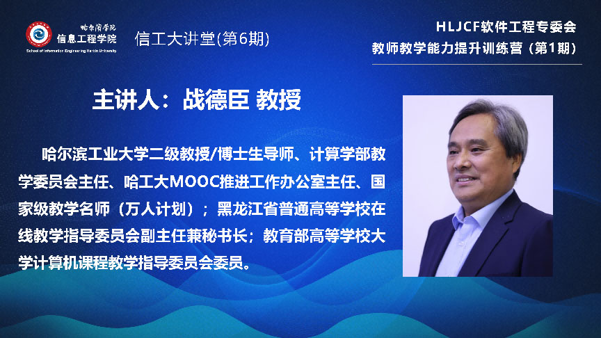 2022年11月28日晚,哈尔滨工业大学战德臣教授应我院邀请作“线上线下混合式一流课程建设与申报”线上专题讲座。本次活动基于腾讯会议平台,是我院信工大讲堂(第6期)讲座活动,同时也作为省计算机学会软件工程专委会教师能力提升训练营第1期活动。活动由省计算机学会软件工程专委会副主任、信息工程学院王克朝院长主持,共210余名教师参加。