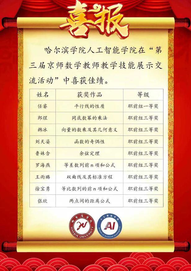 本次展示交流活动共收到来自全国27个省市自治区职前组和在职组教师提交的作品763件。经组织专家评审,评选出常规组全国一等奖48个,全国二等奖44个,全国三等奖185个,最佳组织奖8个。我校数学与应用数学专业2022级任睿、郎煜、张欣、徐宝勇、王雨璐、鲁姝含、罗海燕、刘天姿、韩冰九位同学获得了一等奖1项、三等奖8项的好成绩,较之第二届比赛获奖人数提升1人。同时我校获得最佳组织奖荣誉称号。