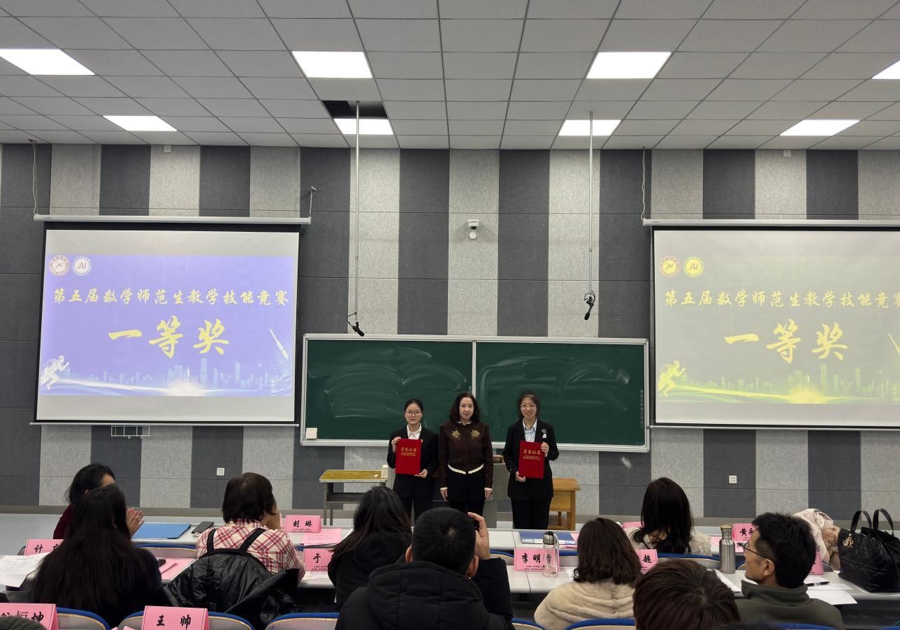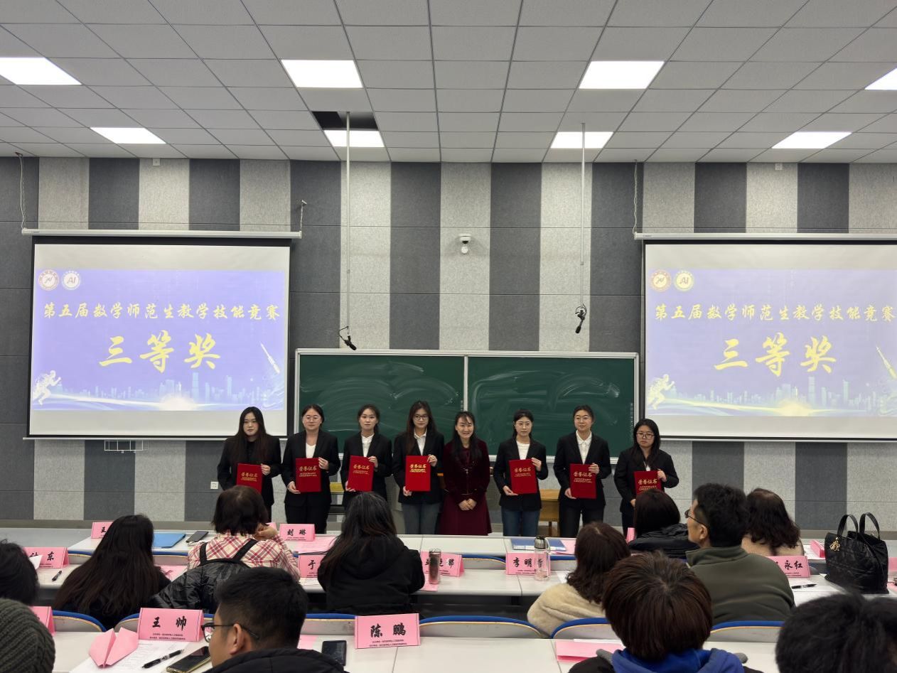 经过激烈比拼,评审团综合教学内容、教学方法、教学素质与教学创新等维度,评选出一、二等奖;三等奖则依据初赛成绩直接产生。赛后,数学系主任王君副教授对选手们的整体表现进行了专业点评,充分肯定了他们在教学设计中体现出的创新意识与育人温度。数学系2025级许多以青春洋溢的歌曲《第一天》代表2024级、2025级同学展现学习师范技能的决心。王知非院长在闭幕致辞中向所有获奖选手表示热烈祝贺,并强调,学院将持续搭建高质量育人平台,深化师范生培养体系改革,引导广大青年学子自觉传承和弘扬教育家精神。他希望全体师范生以此为契机,不断提升教育教学能力,努力成长为有理想、敢担当、能吃苦、肯奋斗的新时代“大先生”。活动最后,学院领导与嘉宾为获奖选手颁发荣誉证书,并合影留念。
