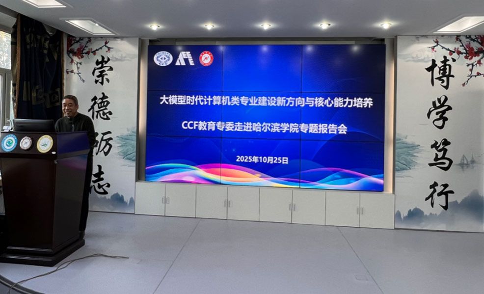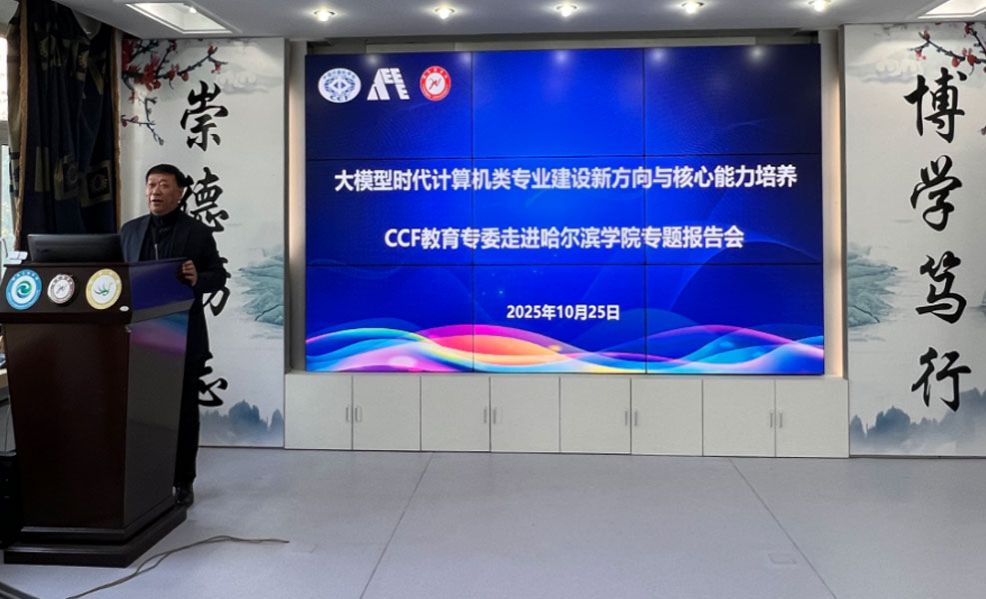 在大模型技术深度重塑教育形态与科研范式的时代背景下,技术变革对人才培养目标的新要求,为探索计算机类专业建设的创新路径。10月25日,由中国计算机学会(CCF)联合信息技术新工科产学研联盟专家进高校工作委员会、联盟实践教学工作委员会主办,CCF教育专委、哈尔滨学院教务处、人工智能学院共同承办的“CCF教育专委走进哈尔滨学院暨大模型时代计算机类专业建设新方向与核心能力培养学术报告会”在人工智能学院成功举行。