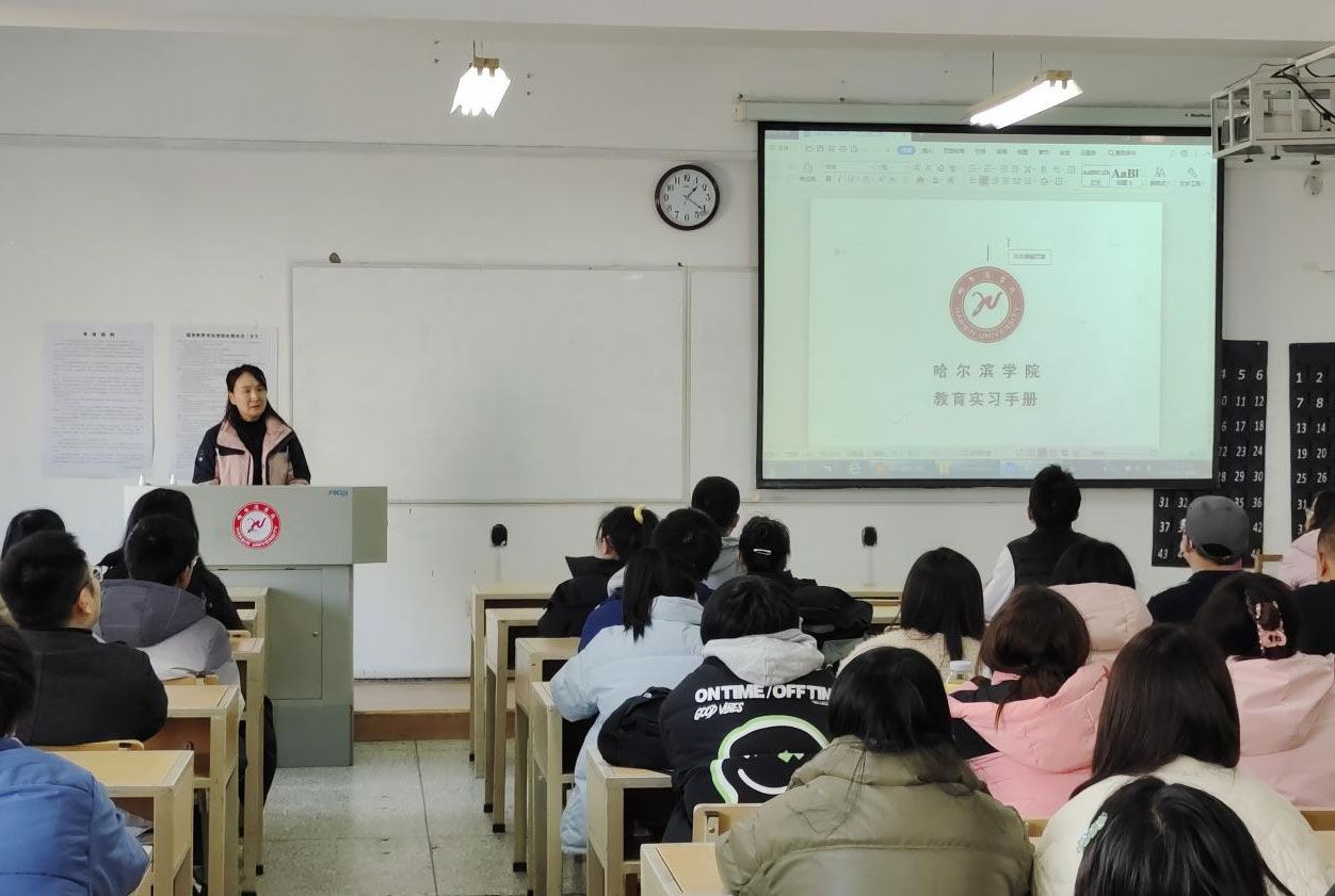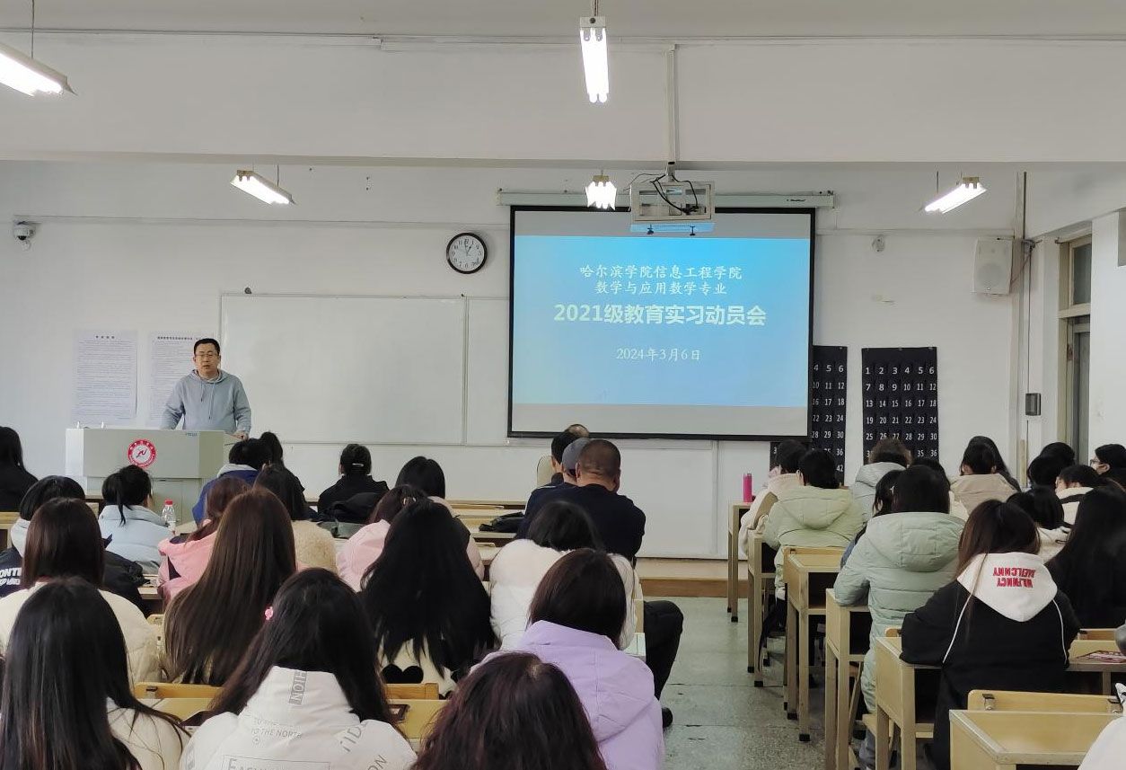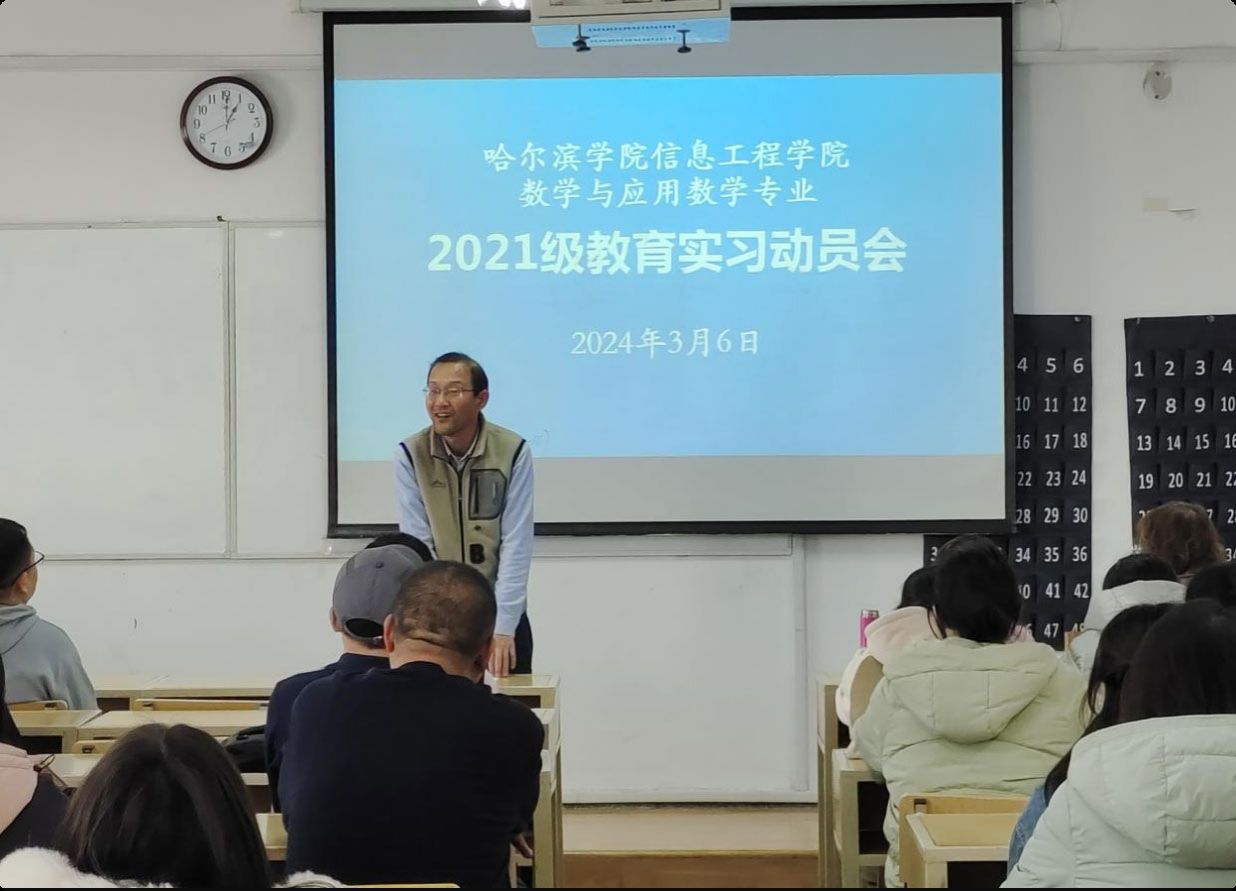 (文/王君)2024年3月6日,哈尔滨学院信息工程学院成功举办了数学与应用数学专业2021级教育实习动员大会。出席此次动员会的有信息工程学院副院长宗明魁、计东主任、全体实习指导教师以及即将参与教育实习的学生们。动员会由宗明魁副院长主持,他详细讲解了教育实习的重要性和目标,鼓励学生们积极投入到即将开始的实习中去,以期在实践中不断提升自我,积累宝贵的教学经验。