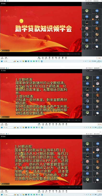 在会上,励小巍老师以生动易懂的方式,对国家助学贷款政策进行了详尽的解读。他深入浅出地讲解了高校助学贷款的申请时间、贷款期限等核心要素,并现场演示了个人信息变更及毕业确认申请的实操流程。此外,他还系统地介绍了还款的基础知识、策略与技巧,并通过实际案例和法律法规的讲解,让同学们对助学贷款的还款责任有了更加清晰的认识。励小巍老师特别强调了还款时效性的重要性,警示同学们一旦逾期还款,将会对个人信用记录产生不良影响,进而阻碍个人未来的发展。