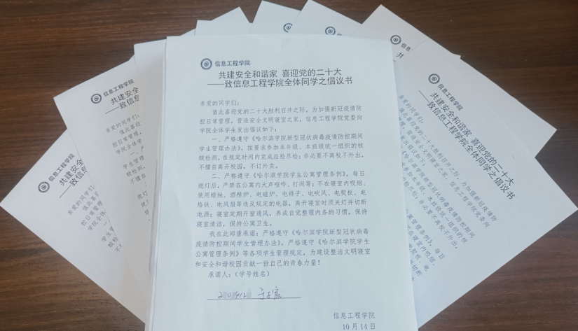 学院党委组织全体在校学生共同签订“共建安全和谐家 喜迎党的二十大”倡议书,郑重承诺严格遵守《哈尔滨学院新型冠状病毒疫情防控期间学生管理办法》《哈尔滨学院学生公寓管理条例》等各项学生管理规定,为建设整洁文明寝室、安全和谐校园和清朗网络空间贡献青春力量,为党的二十大胜利召开营造良好氛围。