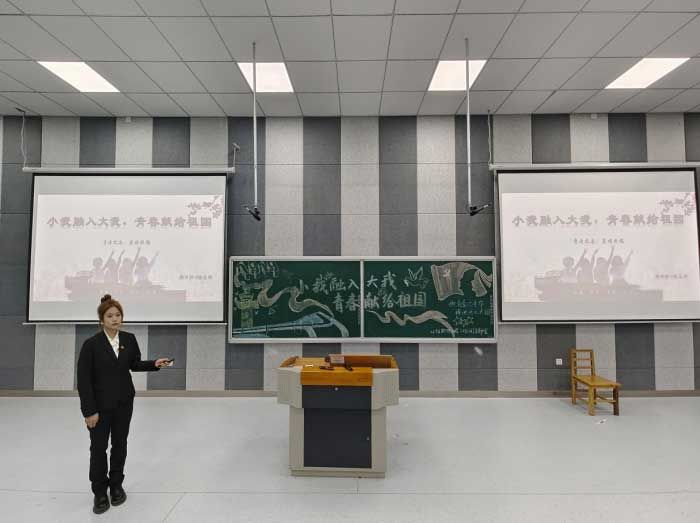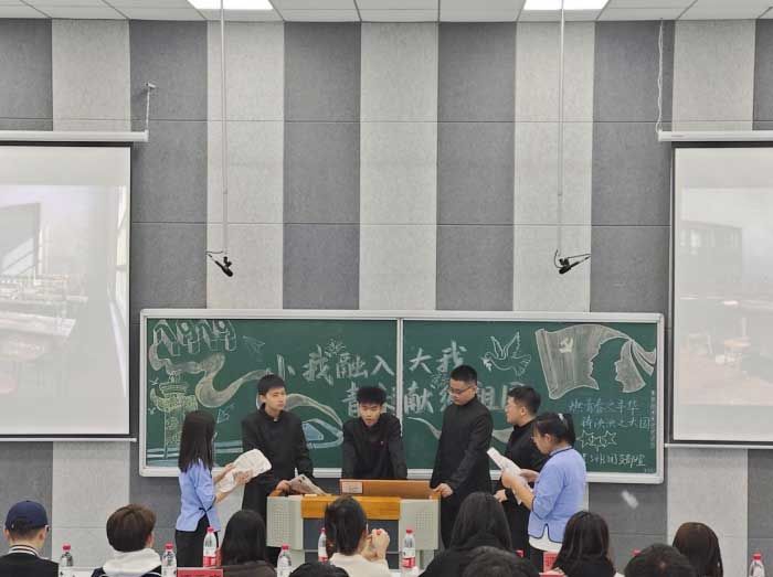 首先由软件5班团支书带领班级同学了解开展此次团会的目的。而后,软件工程5班集体同学为大家表演了以抗日时期的青岛为背景的舞台剧《历史今朝》。通过本次舞台剧的演绎,使同学们对历史有了进一步的了解,真实还原了五四时期青年的思想觉醒与反抗。最后,22级软件五班集体同学进行了一段红色文字与红心相照应的诗朗诵以及向党向国的深情献唱。每一位信工学子在此次团会中都将自身的小我融入班级和祖国的大我之中,深刻的理解到“青春献给祖国”的真实含义。