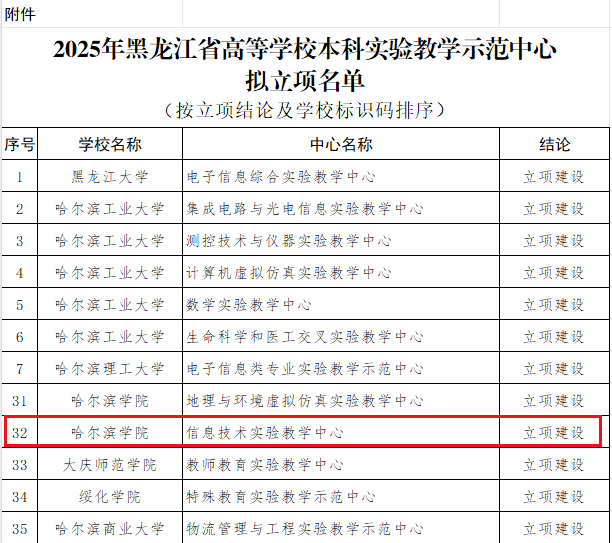 2025年7月10日,黑龙江省教育厅正式公布2025年黑龙江省高等学校本科实验教学示范中心拟立项名单,我院信息技术实验教学中心成功入选,获批省级实验教学示范中心立项建设项目。这是“十四五”期间,继获批黑龙江省智能感知与智能软件重点实验室、黑龙江省旅游信息服务工程技术研究中心等省级科研创新平台之后,教学实验室建设方面获得新突破。