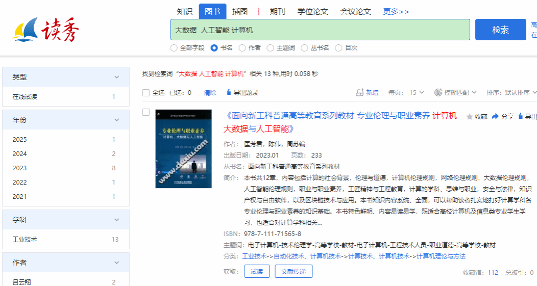 在校园IP范围内,直接访问读秀知识库服务平台(http://www.duxiu.com),或通过图书馆主页找到该数据库的链接进入。