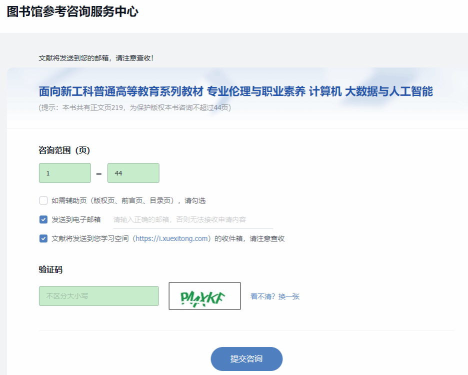 进入文献检索结果详情页后,如果所需文献不是馆藏纸本或电子资源,可点击“文献传递”,按照提示流程填写邮箱信息和想要获取图书的页码范围,即可在邮箱中收到所需文献(备注:一次最多可申请50页并且传递总量不超过整本图书的20%,有效期为20天)。