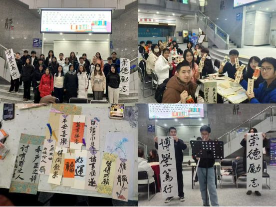 12月1日,由国学社学生在图书馆一楼大厅进行书法展示展览,同时还有“书名接力猜猜猜”、“书法接龙”、“共同制作书法书签”等活动。