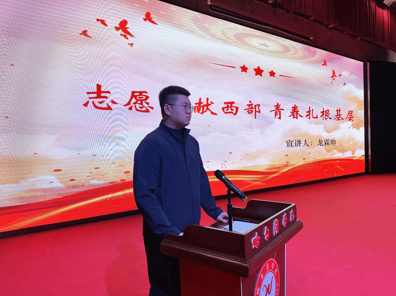 为增强宣讲实效,学校特邀王新睿、龙霖帅两位我校西部计划在岗志愿者分享他们的志愿服务经历,讲述自己在西部计划工作岗位的所见所闻、所思所感,展现了西部计划志愿者扎根基层、无私奉献的青春风采,并呼吁学弟学妹把握机会,在西部热土书写无悔青春,在服务中实现自己的人生价值。