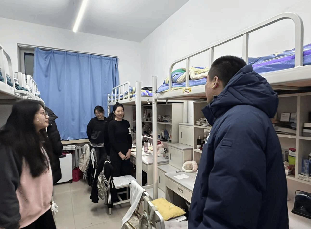 走访寝室食堂,关心关爱到位。各带队老师走访志愿者寝室食堂,向同学们在志愿服务过程中的辛苦付出给予充分肯定,了解大家在备战亚冬会过程中的压力源,鼓励大家保持乐观向上的心态。同时聚焦安全问题,强调了寝室相关安全隐患,提醒同学们要安全用电按时归寝。