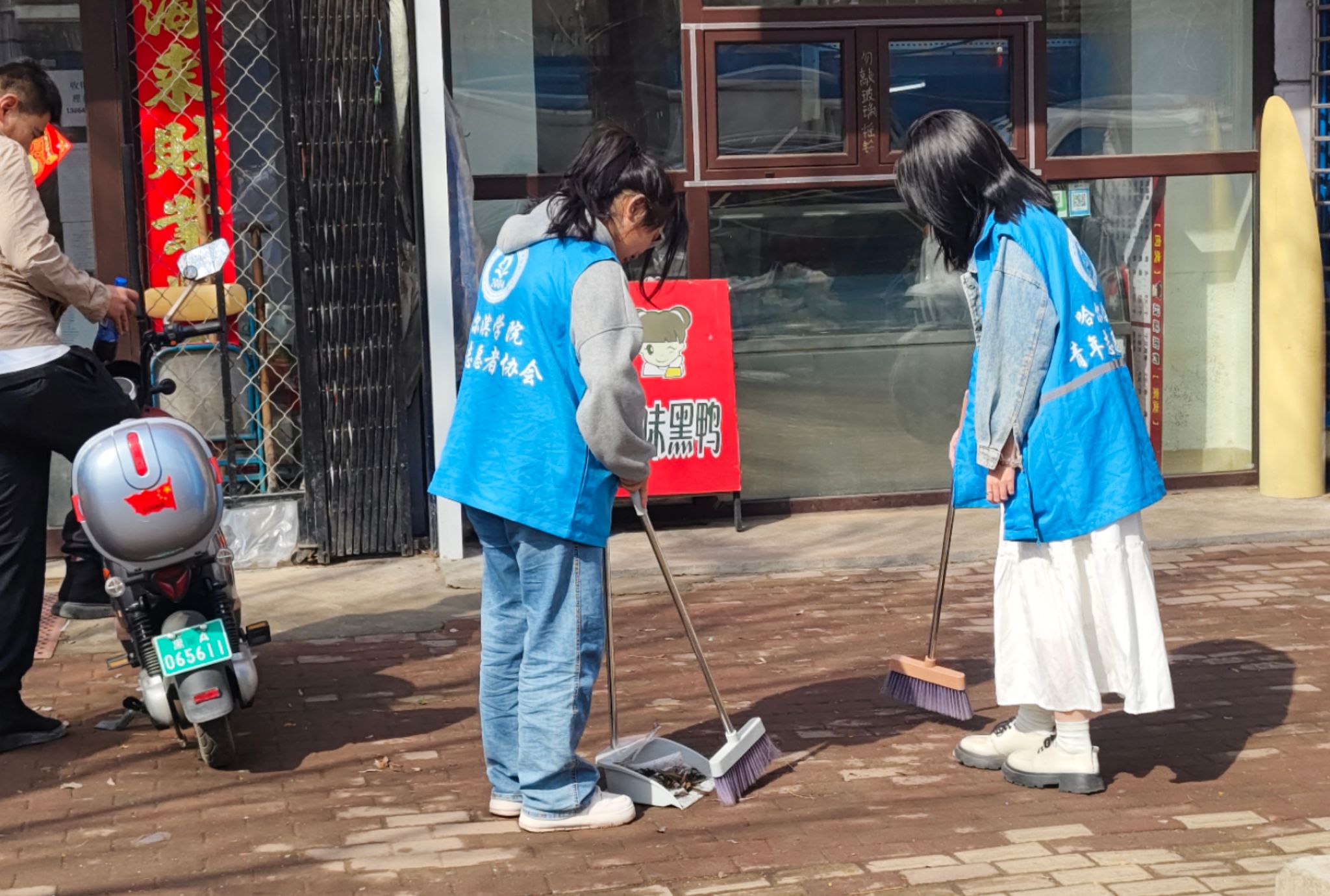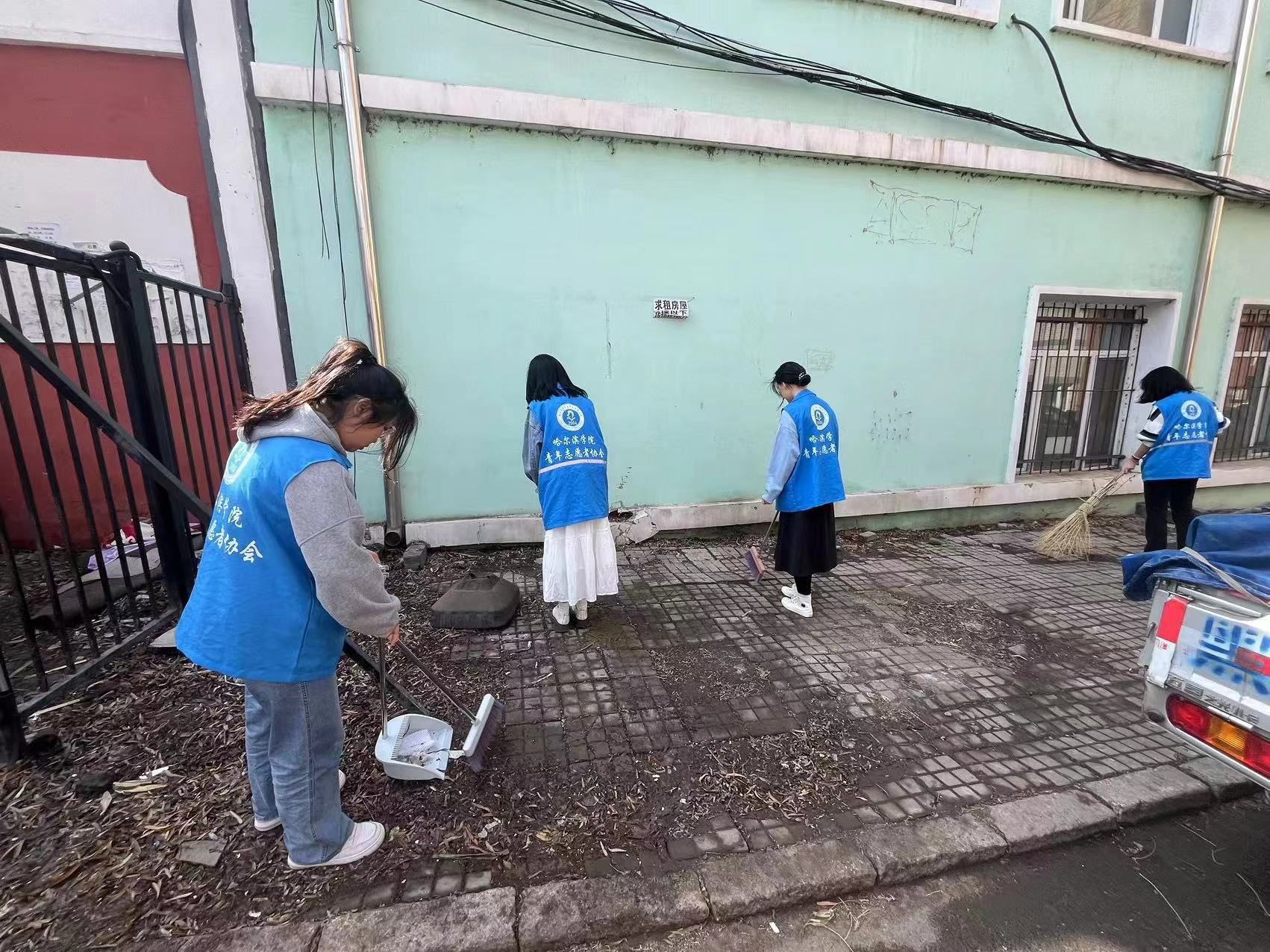活动当天,志愿者们早早来到指定地点集合,身着统一的蓝色志愿者马甲,带着劳动工具迅速投入到环境治理工作中。在街道旁,马路边,商铺前,快递站等地都能看到勤劳的蓝色身影,他们认真清扫着街道上的落叶树枝、食品包装袋、包装盒,被遗落的快递袋等杂物。经过几个小时的辛勤劳动整个街道变得干净整洁、焕然一新,他们用实际行动展现出了哈院青年志愿者的使命担当。