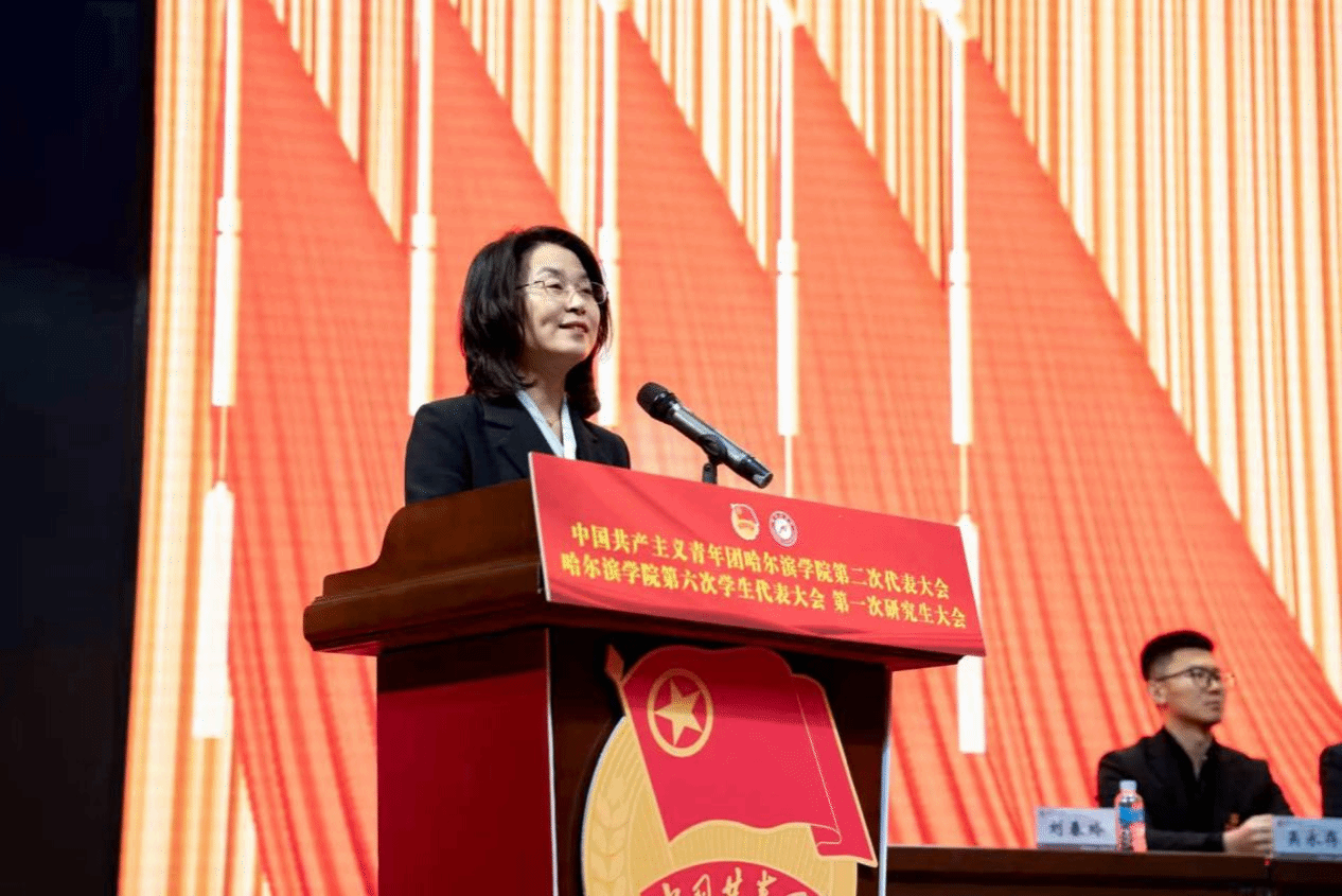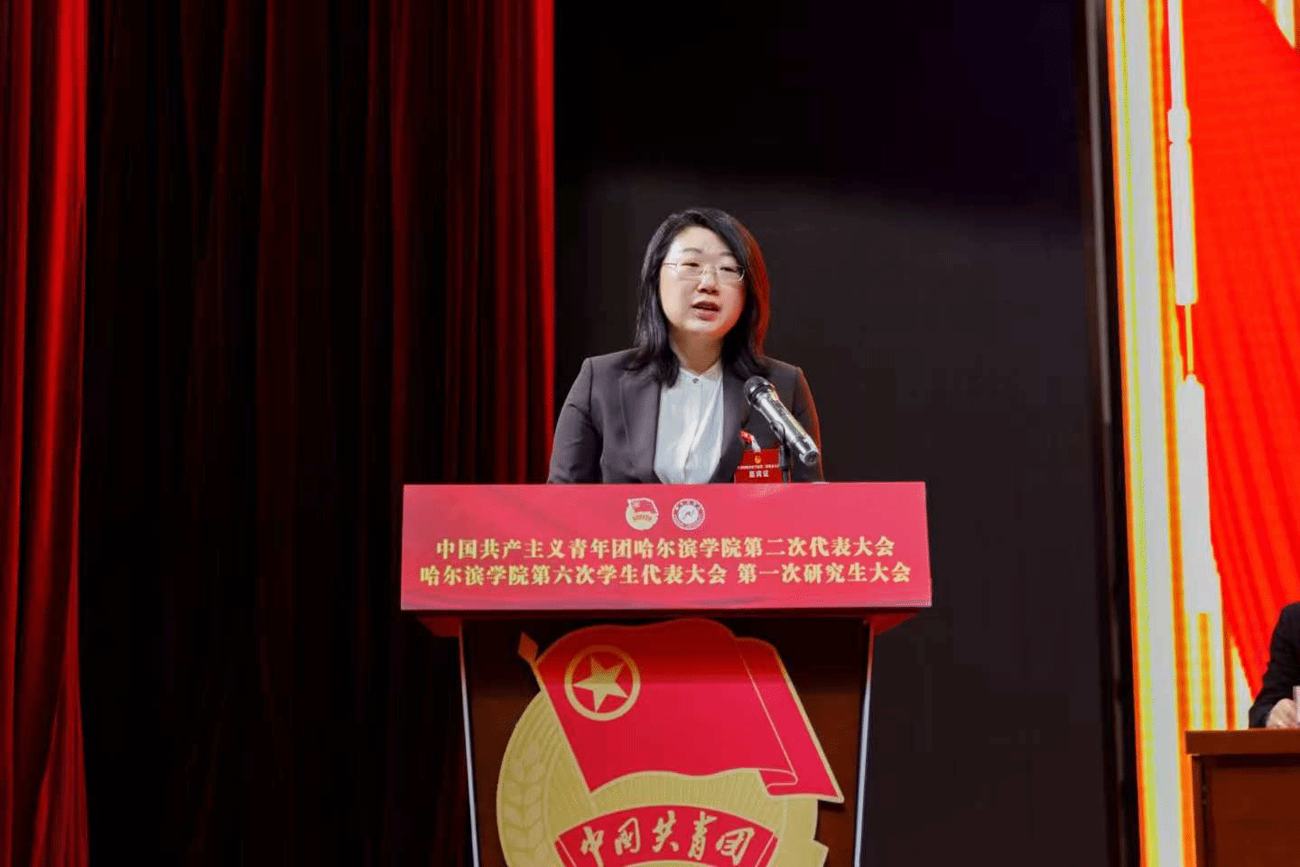 校工会副主席康根东在致辞中表示,校团委始终牢记党的嘱托,紧扣学校中心工作,扎实推进思想政治教育与团学活动,为学校改革发展作出积极贡献。站在新的历史起点,校工会将与校团委加强协同、携手共进。哈尔滨师范大学团委书记刘春玲代表兄弟院校对大会召开表示热烈祝贺。她指出,近年来哈尔滨学院团委在思想引领、校园文化建设、创新创业及志愿服务等方面成效显著。未来,愿双方持续深化合作,共同谱写新时代共青团事业发展的崭新篇章。