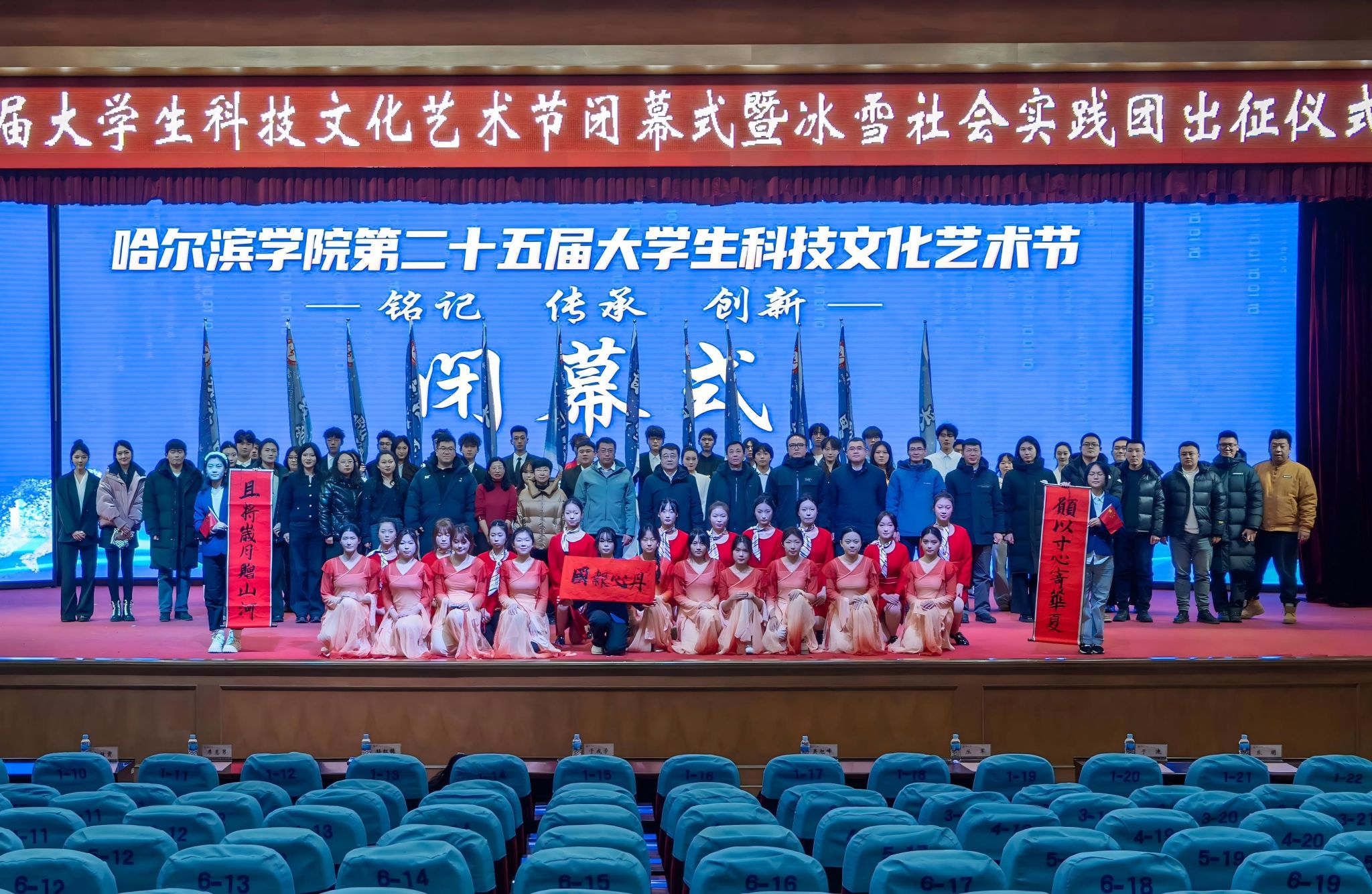 (文/李一宁)12月10日下午,我校第二十五届大学生科技文化艺术节闭幕式暨冰雪社会实践团出征仪式在图书馆报告厅隆重举行。校长、党委副书记于成学,副校长孙红镱、吴旭峰出席并为获奖单位及个人颁奖。党委组织部、党委宣传部、科技处、学生处、图书馆、校团委负责人,各学院党委(总支)书记、副书记、分团委书记及师生代表500余人参加闭幕式。