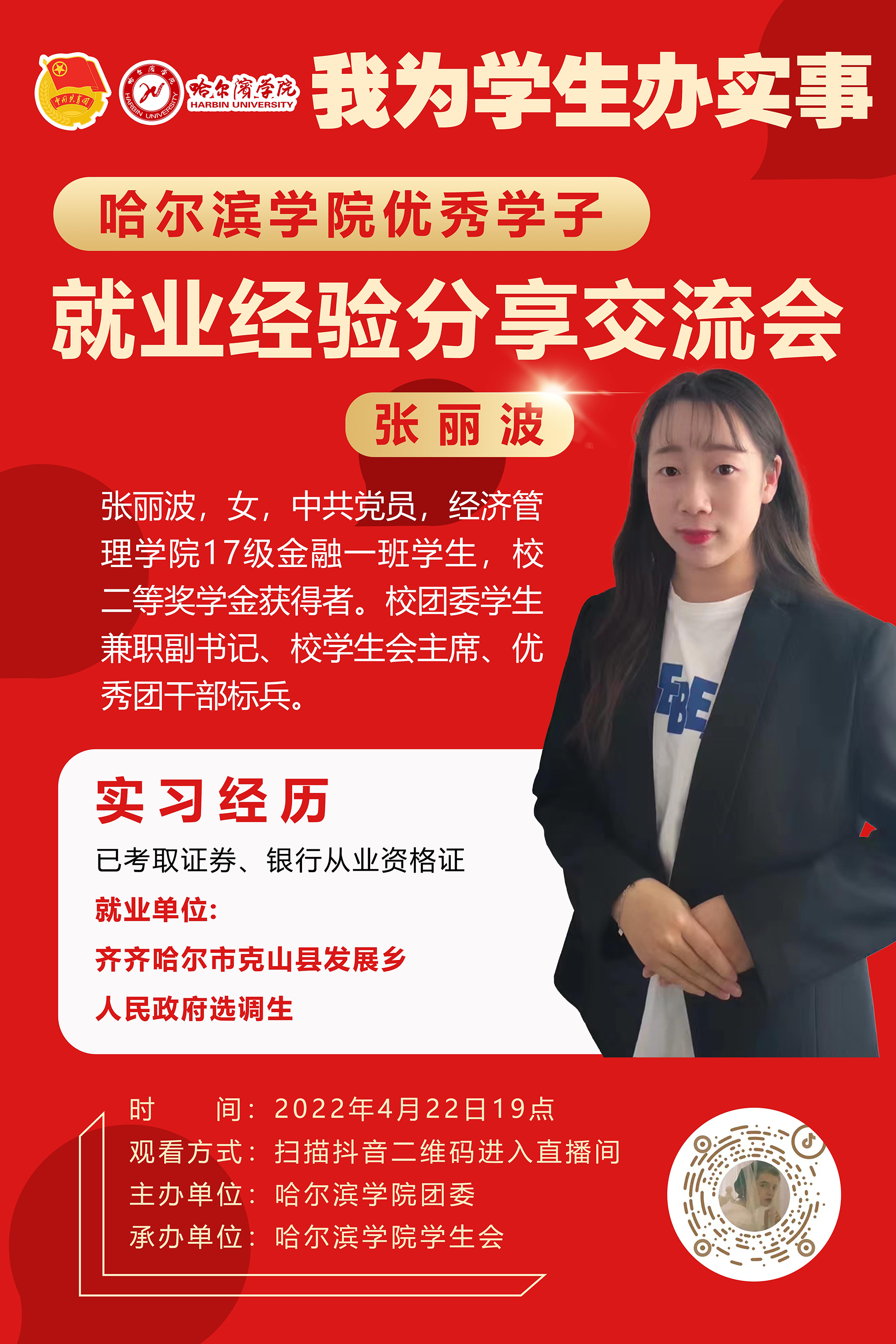 为深入贯彻落实习近平总书记的重要讲话精神,切实做到“学党史、悟思想、办实事、开新局”,校团委、校学生会坚持把“我为学生办实事”实践活动作为“党史学习教育”的重要内容,用心用情用力解决学生的所盼所忧。2022年毕业季即将到来,校团委、校学生会特组织开展“我为学生办实事”—哈院优秀学子互助学习专题讲座系列活动,从就业、考研、考公务员、选调生、四六级考试等多维度助力学生提升学历、优质就业,使学生明确就业方向和选择。