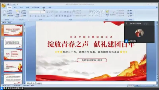 经济管理学院分团委于2022年4月11日开展“绽放青春之声,献礼建团百年”线上主题团日活动。会议由分团委书记吴昊老师主讲。本次团日活动全面回顾了共青团百年历史征程。100年的栉风沐雨,100年的艰辛历程,让经管学子深刻领会了习近平总书记对团员青年一以贯之的要求和期望。通过对团干部的青春风采和青春故事的分享,领悟到了如何担当起时代赋予我们的责任。吴昊老师在会议上教导同学们,新时代的共青团员要接过前辈手中的接力棒。一代人有一代人的使命。目前哈尔滨疫情出现反复,同学们不能返校,但是大家能够安心居家学习生活,就是在积极响应疫情防控政策,尽自己最大的努力为学校,为属地疫情防控做贡献,这就是青年团员的榜样!