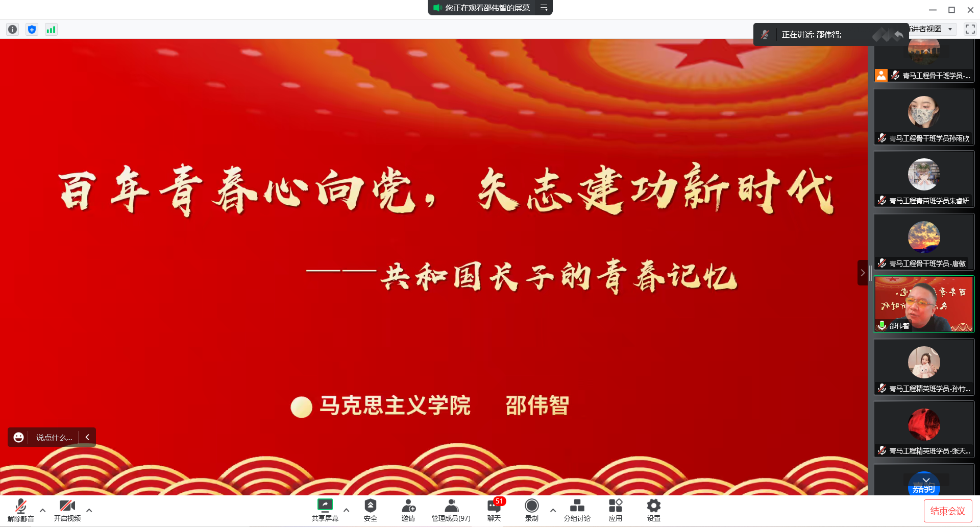 邵伟智老师讲座的主题为《百年青春心向党 矢志建功新时代——共和国长子的青春记忆》,以哈尔滨团组织发展及青年运动背景为线,讲授不同历史时期,哈尔滨青年为中华民族的解放和振兴奉献青春、智慧和力量,立下不朽功绩的典型事例和人物,以此启迪当代青年学生,青春正好,生逢其时,需要坚定信念,奋进新征程,建功新时代。