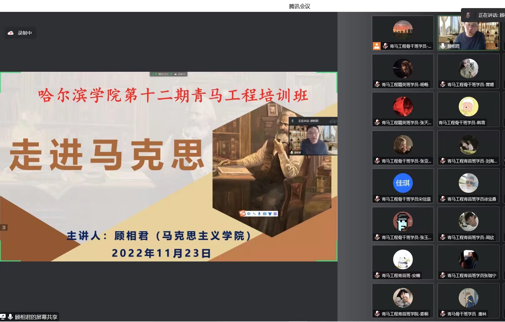(文/黄婷婷)为深入学习宣传贯彻党的二十大精神,认真领会宣传习近平总书记关于青年工作的重要思想,增强团组织的吸引力和凝聚力,11月23日下午,校团委特邀马克思主义学院顾相君老师、邵伟智老师通过线上的形式为我校第十二期“青马工程”培训班开展《走进马克思》、《百年青春心向党 矢志建功新时代——共和国长子的青春记忆》专题理论培训。