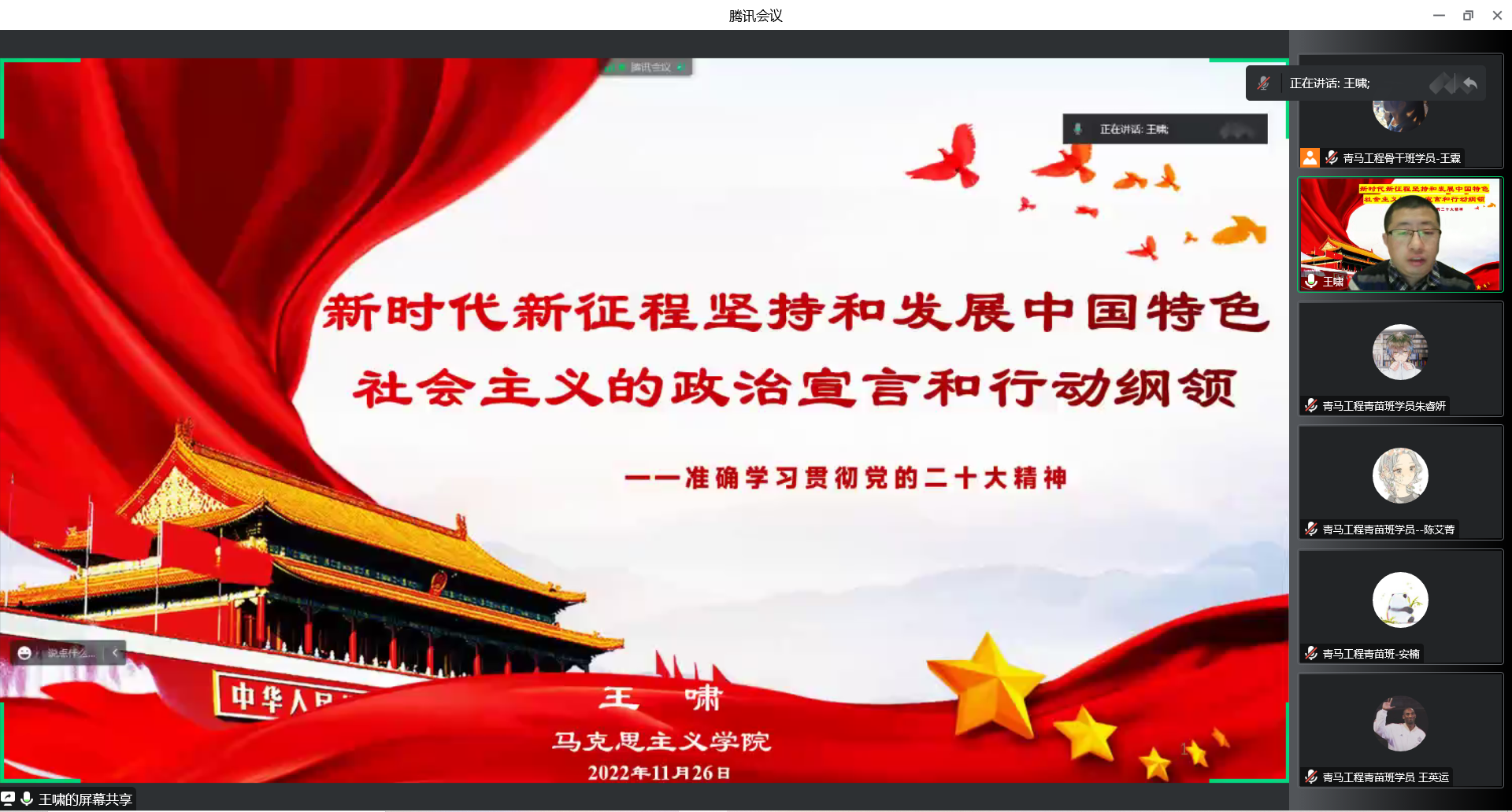 (文/黄婷婷)为深入学习贯彻党的二十大精神,加强对青年的思想政治引领,为党培养一批信仰坚定、能力突出、品学兼优、作风过硬的青年政治骨干,11月25、26日,我校第十二期“青马工程”培训班百余名学员通过线上学习的方式开展集中理论学习。马克思主义学院王莹老师、王啸老师分别开展了《激扬青春梦,奋进新征程》、《新时代新征程坚持和发展中国特色社会主义的政治宣言和行动纲领——准确学习贯彻党的二十大精神》专题理论培训。