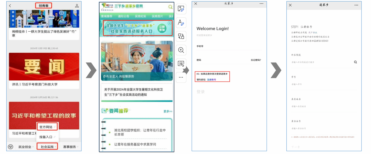 (二)报名申请。在“创青春”微信公众号的“社会实践”栏目入口登录“官方网站”—“社会实践活动报名入口”—“返家乡项目”,按分类、区域搜索岗位信息,确认选择合适的岗位后,填报并提交报名信息,等待审核和系统提示信息,按信息指示开展后续操作。通过双向选择方式录取。