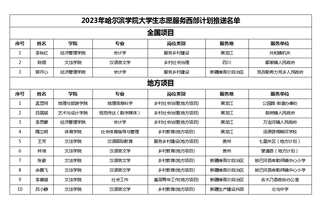 为深入学习贯彻习近平新时代中国特色社会主义思想,进一步引导和鼓励优秀学生到基层工作、到乡村工作,按照《2023-2024年度大学生志愿服务西部计划实施方案》的通知要求,我校认真组织了2023年大学生志愿服务西部计划志愿者选拔工作。经本人申请、资格审查、学院推荐、面试、心理测试、体检等环节,拟推荐李秋红等13名同学为西部计划志愿者。