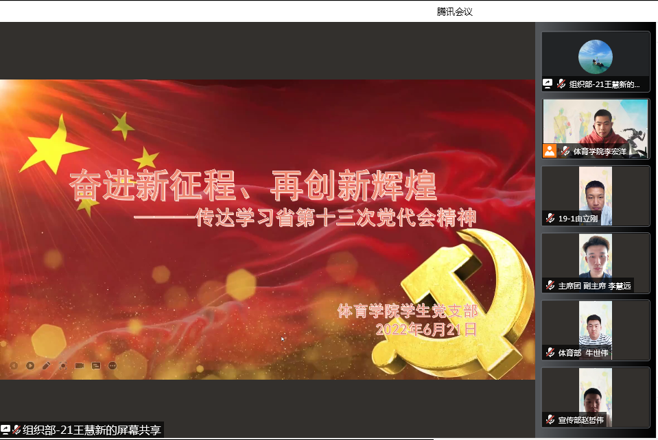 按照省委教育工委《关于推动高校基层党建服务振兴、发展、深化提质增效的具体举措》具体要求,结合我校工作安排,落实开展“千堂党课进支部”活动,体育学院党总支组织所属3个支部于2022年6月21日召开线上支部大会,学院党总支书记以及各支部书记以“奋进新征程、再创新辉煌”为主题进行一次专题党课讲授。对省第十三次党代会精神以及龙江振兴发展的举措进行解读。