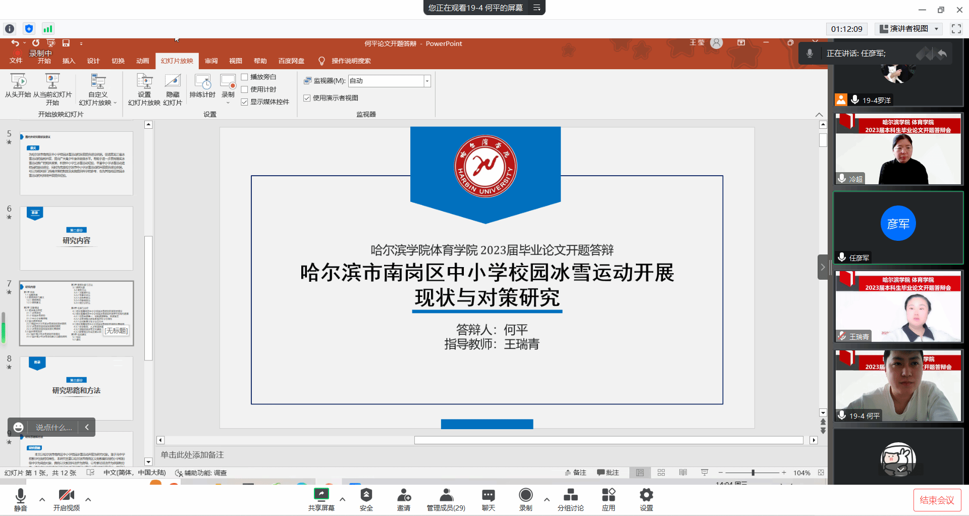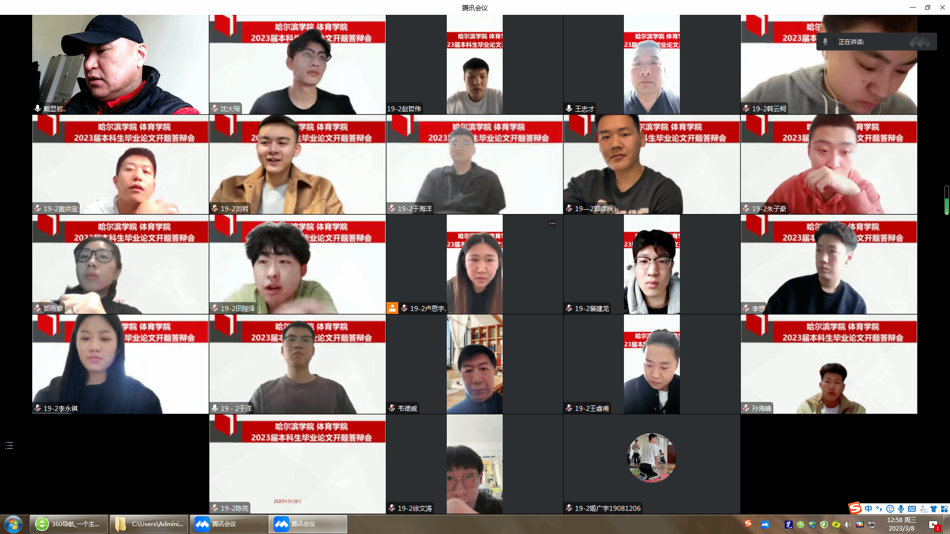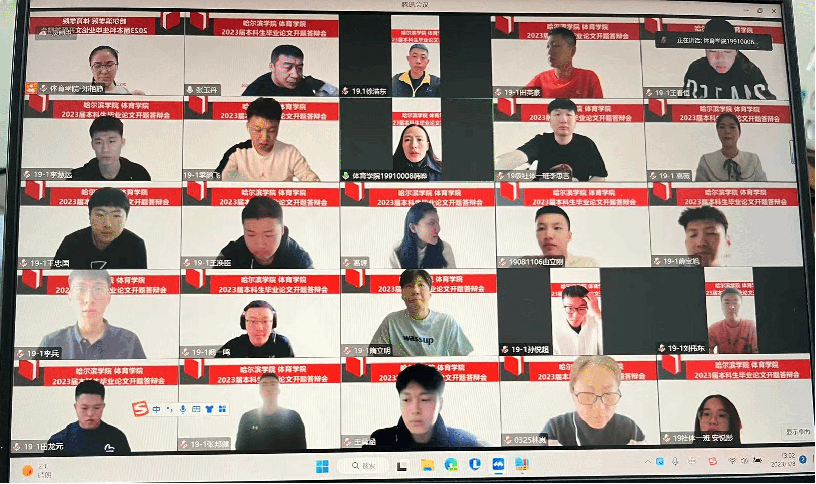 社会体育指导与管理专业2023届本科毕业论文开题答辩会于2023年3月8日13点举行。开题答辩使用腾讯会议平台,以四个自然班为小组,每组三名开题答辩评委老师和一名记录员,对每名学生论文的国内外研究现状、研究目的与意义、研究思路和方法、研究内容、进程计划及文献资料等进行审核并提出意见或建议。