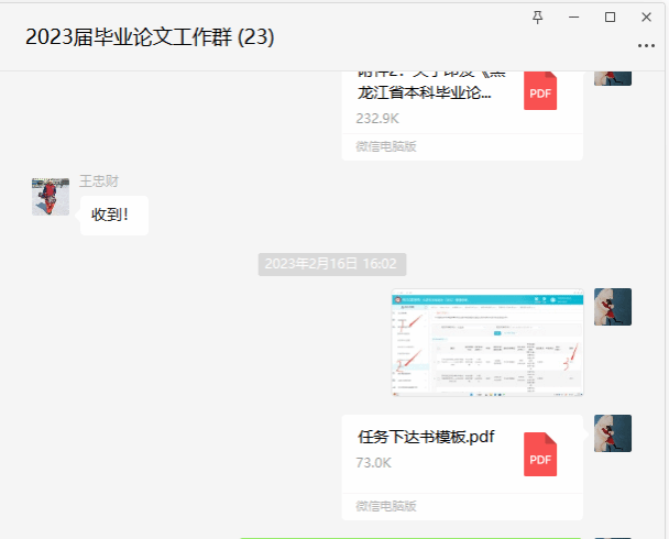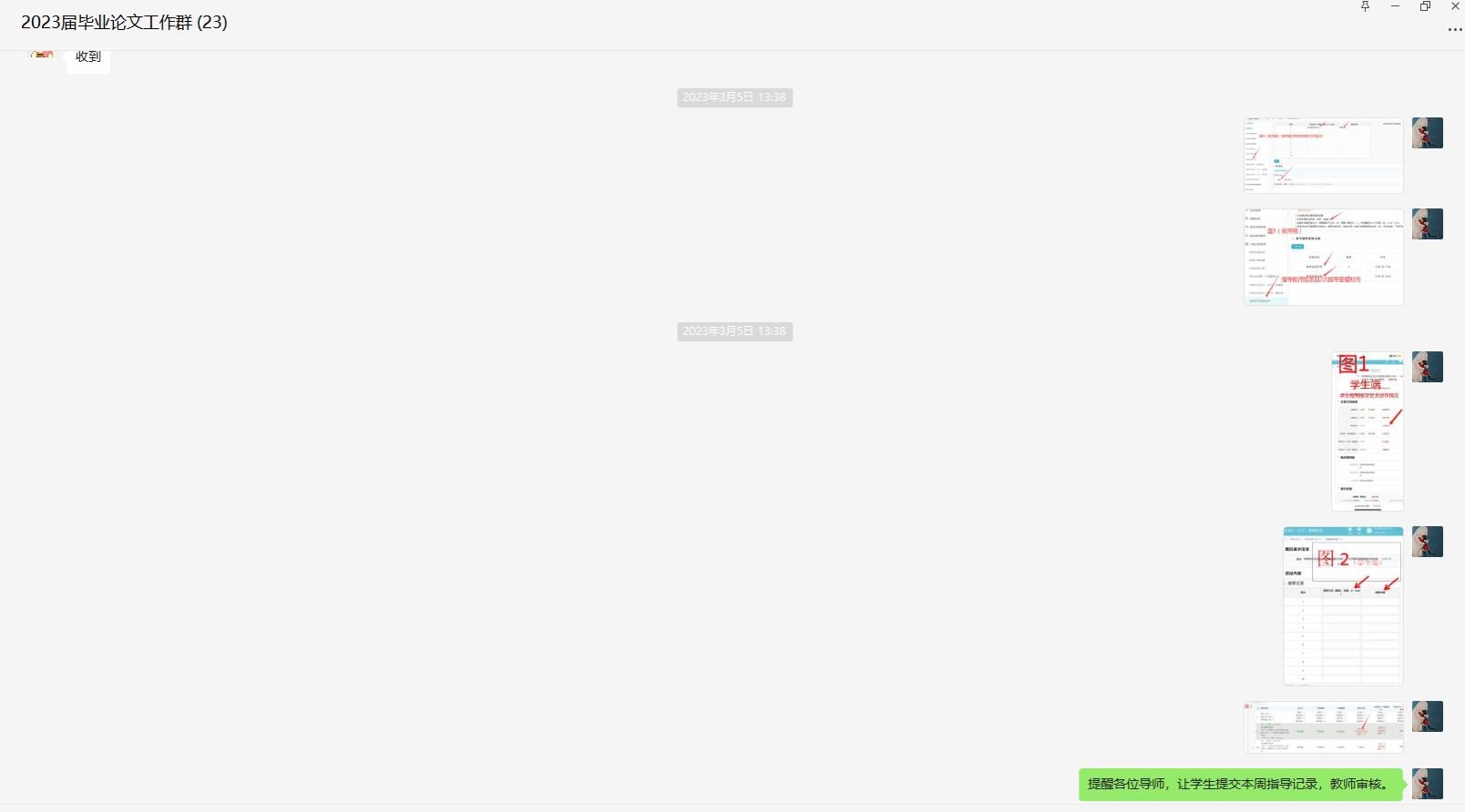 在前期开展的学生与导师互选、确定论文题目的基础上,学院选派专人对学生论文题目进行盲审,并由指导老师整合盲审意见确定最终题目。在2023届本科毕业论文微信工作群中,社会体育指导与管理专业系主任向论文指导老师分享了“哈尔滨学院大学生毕业设计管理系统”的使用心得,以确保每一位老师都能在该系统中熟练操作,指导学生论文创作。