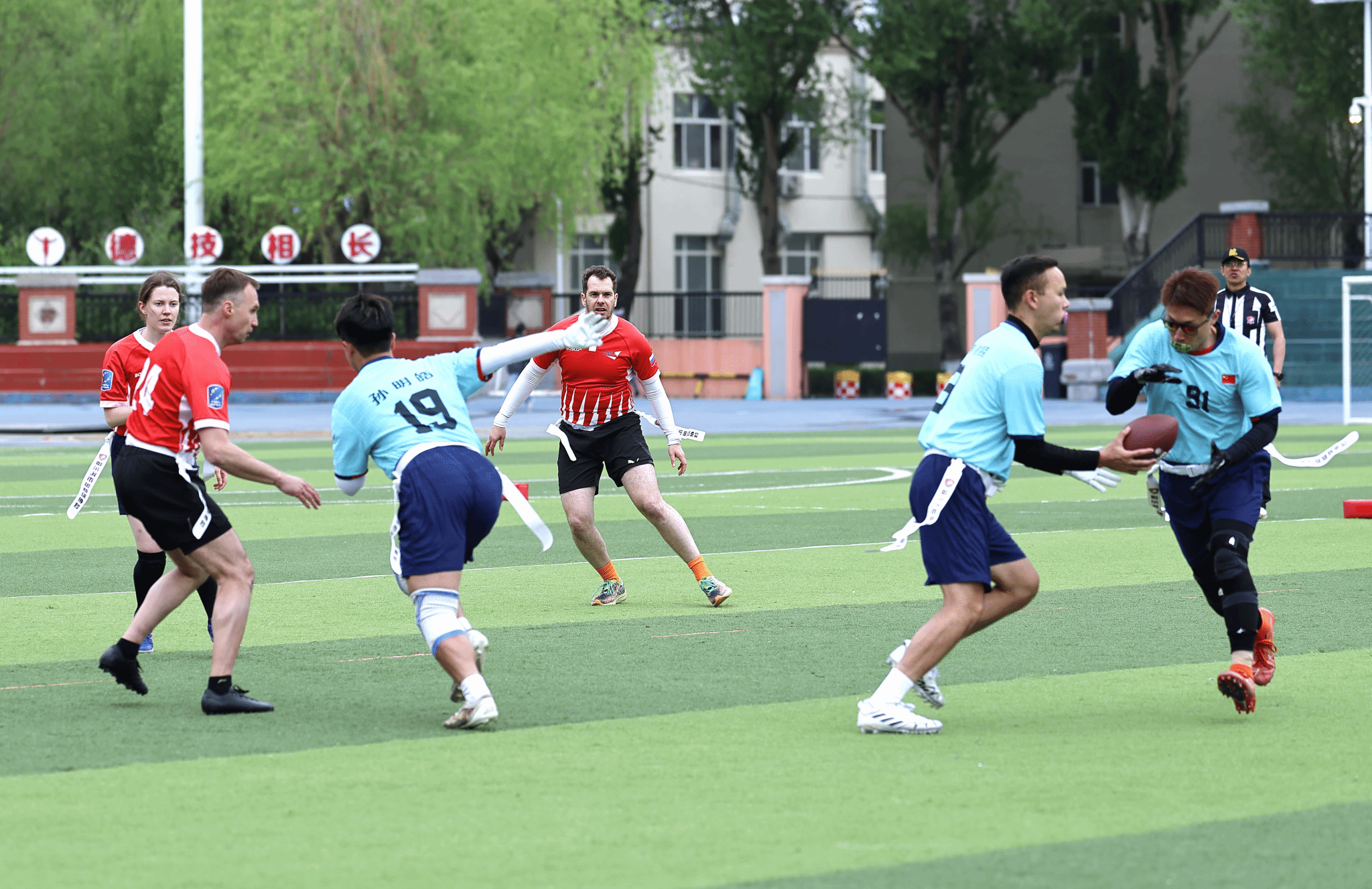 面对实力强劲的对手,队员们毫不畏惧,展现了出色的团队协作能力和个人技术。经过激烈的角逐,我校橄榄球队凭借精准的传球、默契的配合以及关键时刻的得分,最终以2:1的比分险胜俄罗斯队,成功夺冠。这一胜利不仅彰显了我校橄榄球队员的实力,更体现了我院学生勇于拼搏、为国争光的精神风貌。
