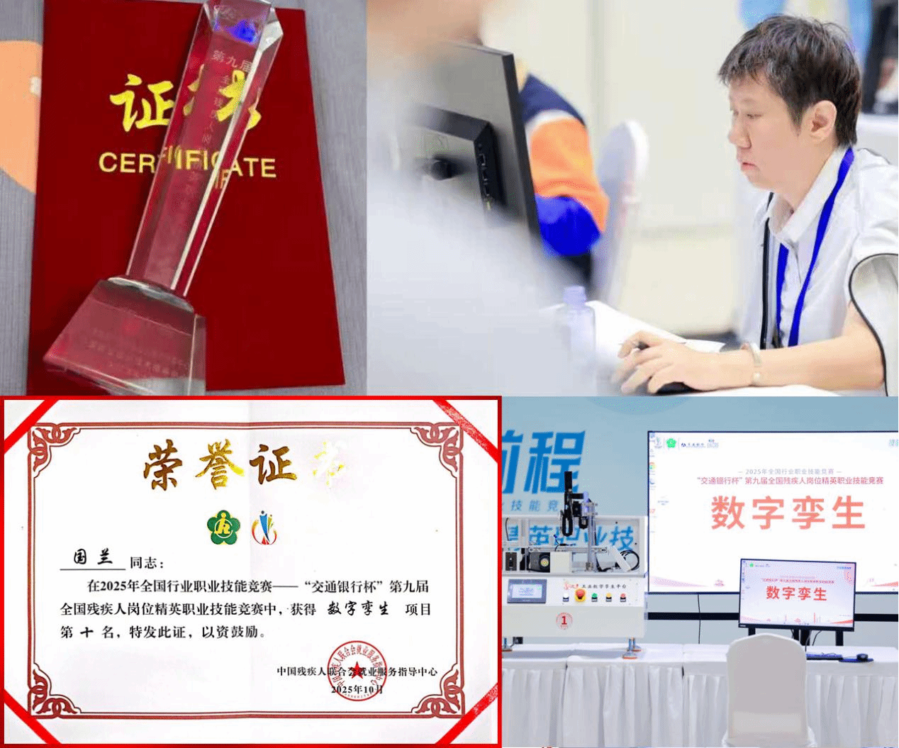 近日,2025年全国行业职业技能竞赛——“交通银行杯”第九届全国残疾人岗位精英职业技能竞赛传来捷报:我校教师国兰凭借精湛技艺,在数字孪生项目中斩获全国第十名,以技能为笔,书写了一名普通教师的奋斗华章。