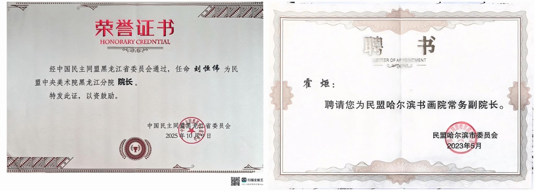 作为艺术教育与创作领域的骨干,刘恒伟教授长期深耕美术教学、创作与交流一线,既注重引导学生扎根生活汲取创作灵感,也积极推动艺术与地方文化、经济的深度融合,其专业能力与社会服务精神广受认可。此次当选民盟中央美术院黑龙江分院院长,不仅是民盟省委对其个人的高度肯定,更是对艺术与设计学院学科建设与师资水平的充分信任。艺术与设计学院教师群体成为民盟中央美术院黑龙江分院组织架构中的重要支撑力量:民盟中央美术院黑龙江分院常务副院长由艺术与设计院长霍炬担任,负责统筹核心事务;常务理事由副院长王占坤出任,参与发展规划;另有4名骨干教师被聘为理事,覆盖艺术等多个专业领域。这一人员构成,既体现了民盟省委对艺术与设计学院师资力量的认可,更是为与民盟省委联动开展艺术实践、人才培养、学术交流搭建了天然桥梁。