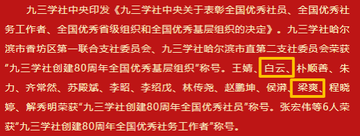 (文/迟云艳)新年伊始,捷报频传。我校三名统战成员、九三学社社员白云、梁爽、国兰老师凭借在本职岗位与参政履职中的突出表现,分获高级别表彰。其中,白云、梁爽老师被授予“九三学社全国优秀社员”称号,国兰老师荣获“黑龙江省自强模范”称号。