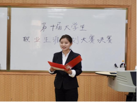 随后,评委老师对每一位选手进行打分,在统计分数的过程中,由于十号选手韩雪和九号选手选手邹凤家喻的分数一样,比赛进入到紧张而又刺激的加赛环节。首先是邹凤家喻进行自我介绍,在介绍的过程中,她用清晰的语言、流畅的表达,将自己的职业目标、发展路径以及实施计划娓娓道来,仿佛怀着必胜的决心。而她的对手韩雪也不甘示弱,面带自信的微笑,眼神中透露出坚定与执着,仿佛在向观众和评委们宣告着自己对未来职业生涯的憧憬与决心。评委老师也对两位选手进行了最后的提问并作出自己的选择。
