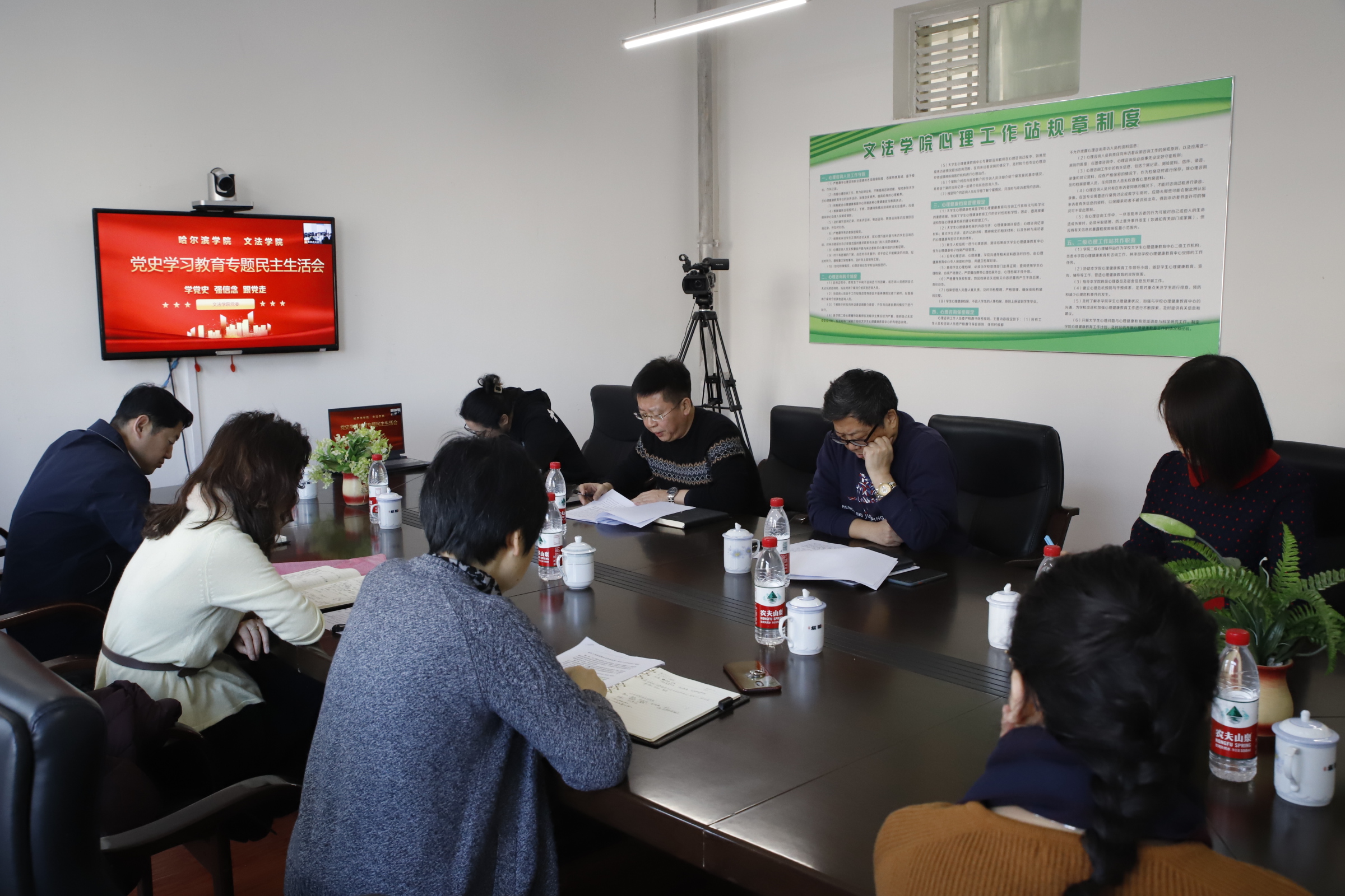 按照市纪委、市委组织部、市党史学习教育领导小组《关于转发<中共中央纪委机关、中共中央组织部、党史学习教育领导小组关于开好党史学习教育专题民主生活会的通知>的通知》(哈组发〔2022〕1号)的要求,根据学校《哈尔滨学院党史学习教育专题民主生活会方案》的工作安排,我院于2022年1月17日(周一)上午9:00在1440会议室召开2021年领导干部党史学习教育专题民主生活会。校工会主席陈威同志,校组织部部长丛军同志、校宣传部部长李铁岩同志、校纪检委副书记张虹同志到会指导。我院党委书记杜真强、院长龚宏、党委副书记王维、副院长季连帅参加会议,副院长周晓燕列席会议,会议由杜真强书记主持。