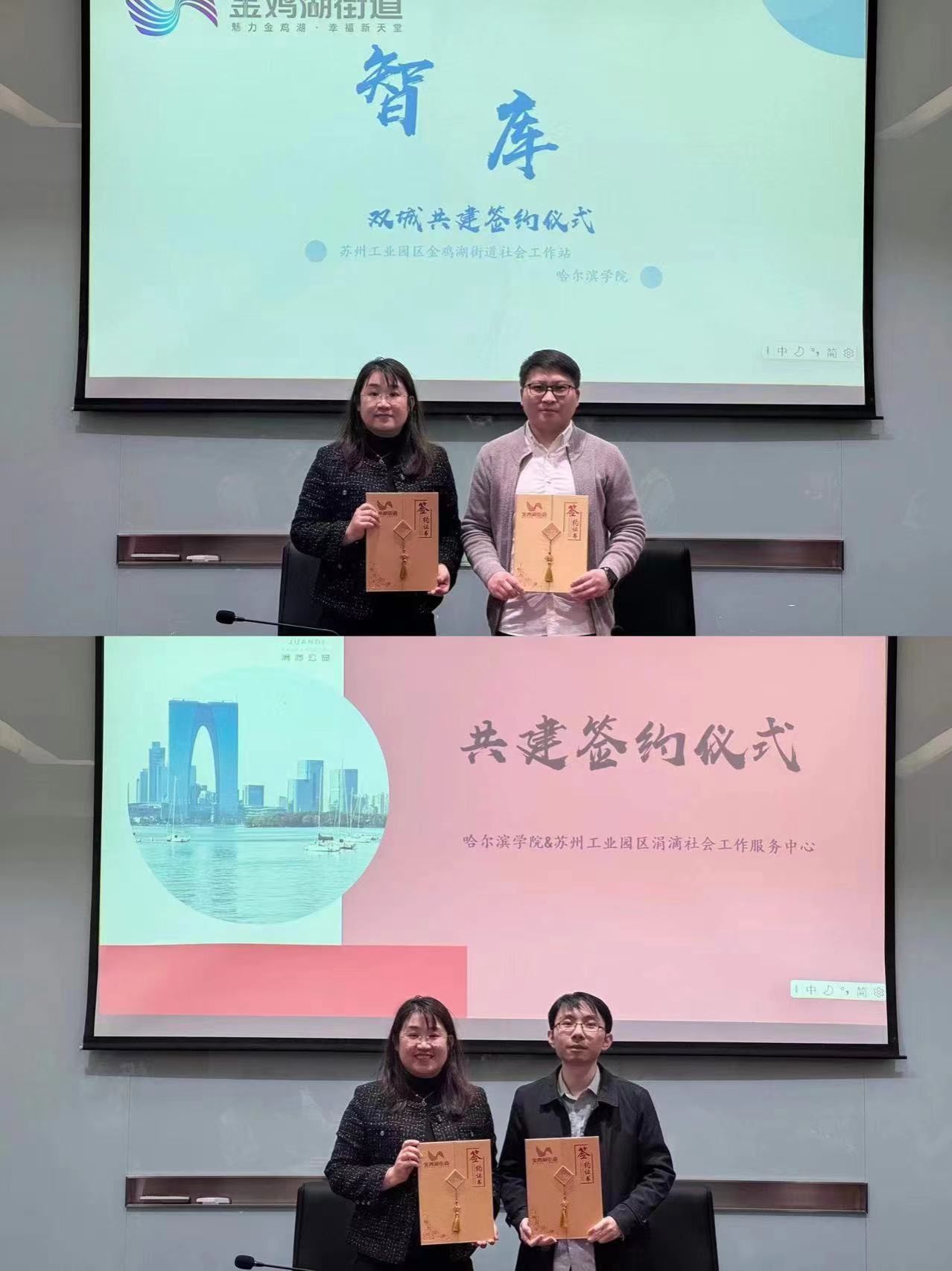 随后,金鸡湖街道办主任许翔与哈尔滨学院黄莹老师签订了校社共建协议,涓滴社工理事长施炜与黄莹老师签署了产教融合合作协议。