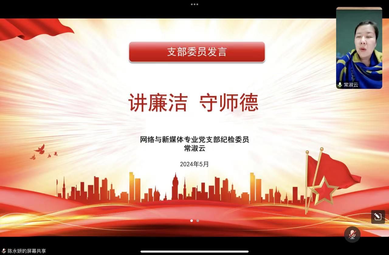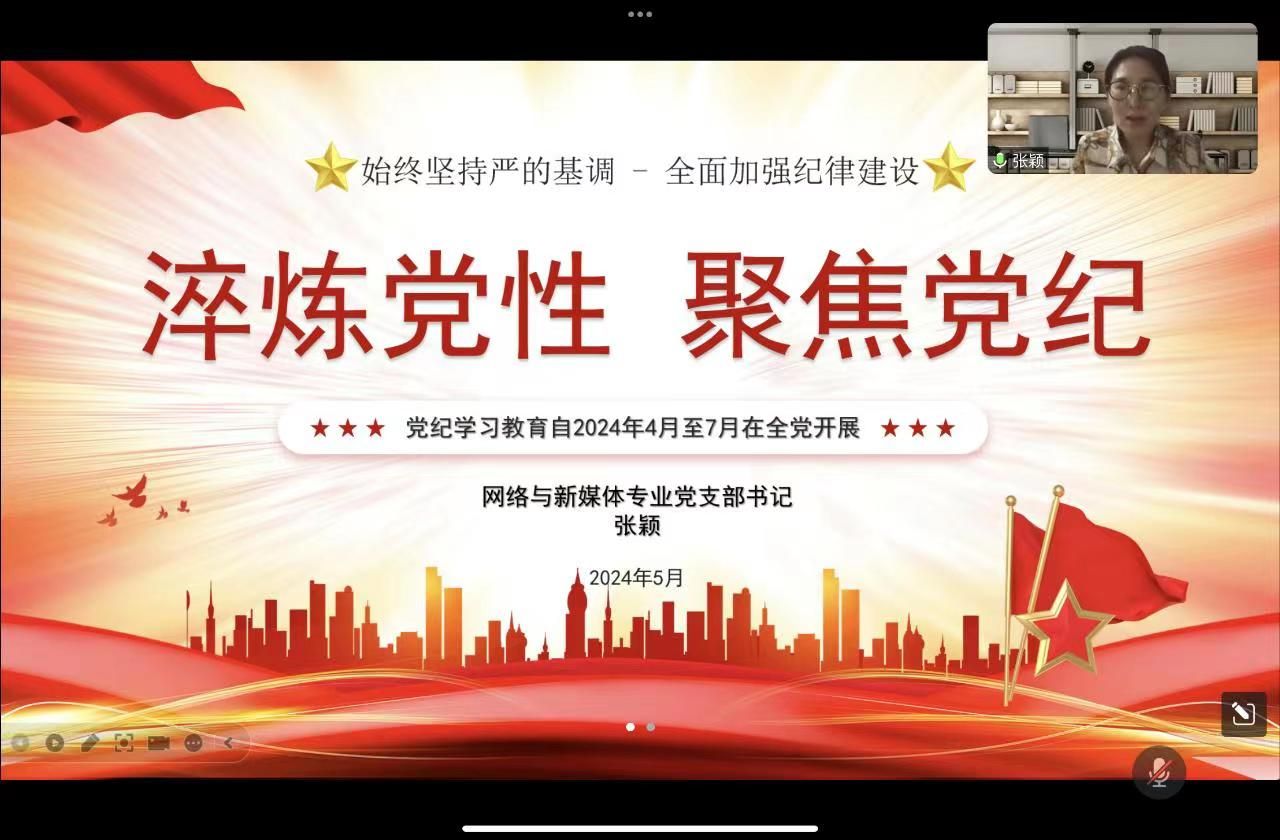 为进一步加强党员对党纪党规的深刻理解与坚定遵循,推动党纪学习教育向纵深发展,5月14日,网络与新媒体专业党支部在张颖书记的带领下,以“淬炼党性 严守党纪”为主题开展了一次专题党课,支部全体党员参加本次学习。