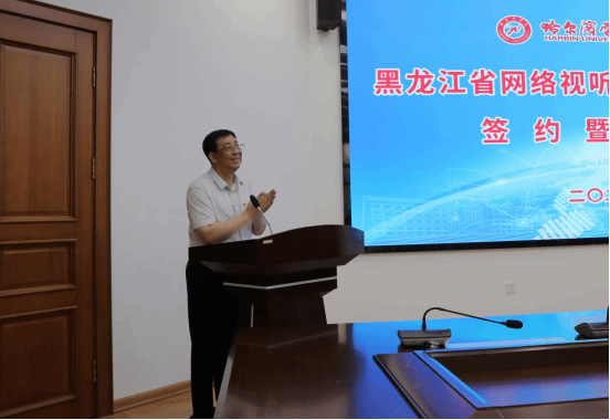 于成学、张广雷共同签署了《哈尔滨学院与黑龙江省广播电视局校政合作战略合作协议》,并为“黑龙江省网络视听人工智能应用实验基地”揭牌,孙红镱、张平为基地执行主任李尧娟、周晓燕颁发了聘任证书。