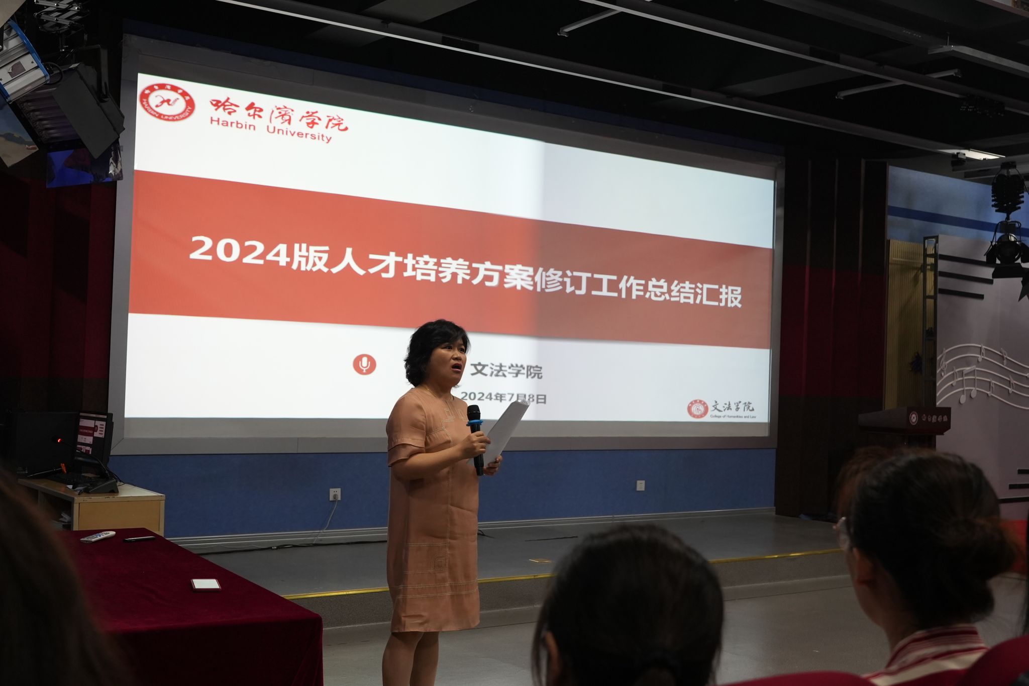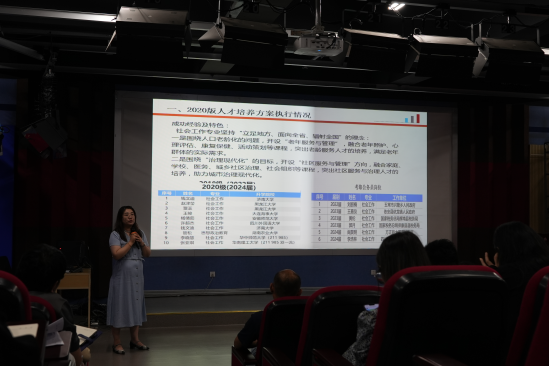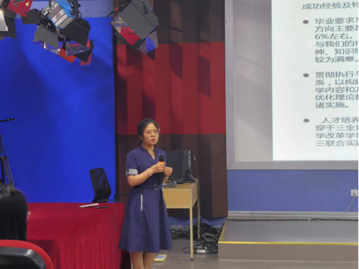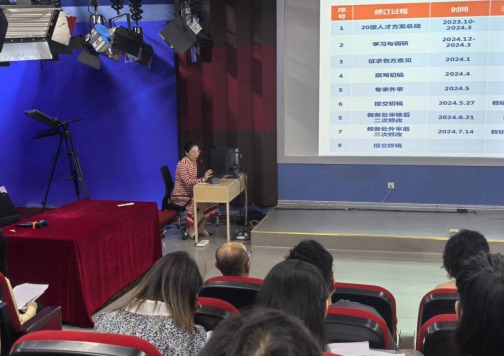 文法学院副院长周晓燕首先针对我院2024版人才培养方案的修订工作进行了汇报,从新一轮培养方案的课程体系、学科建设、教学方法、专业实践等多个角度阐释了新一轮培养方案的创新与改革情况。又总结了新一轮审核评估自评工作的第一轮专项自查情况,针对当下存在的问题及下一步规划进行了细致的分析。