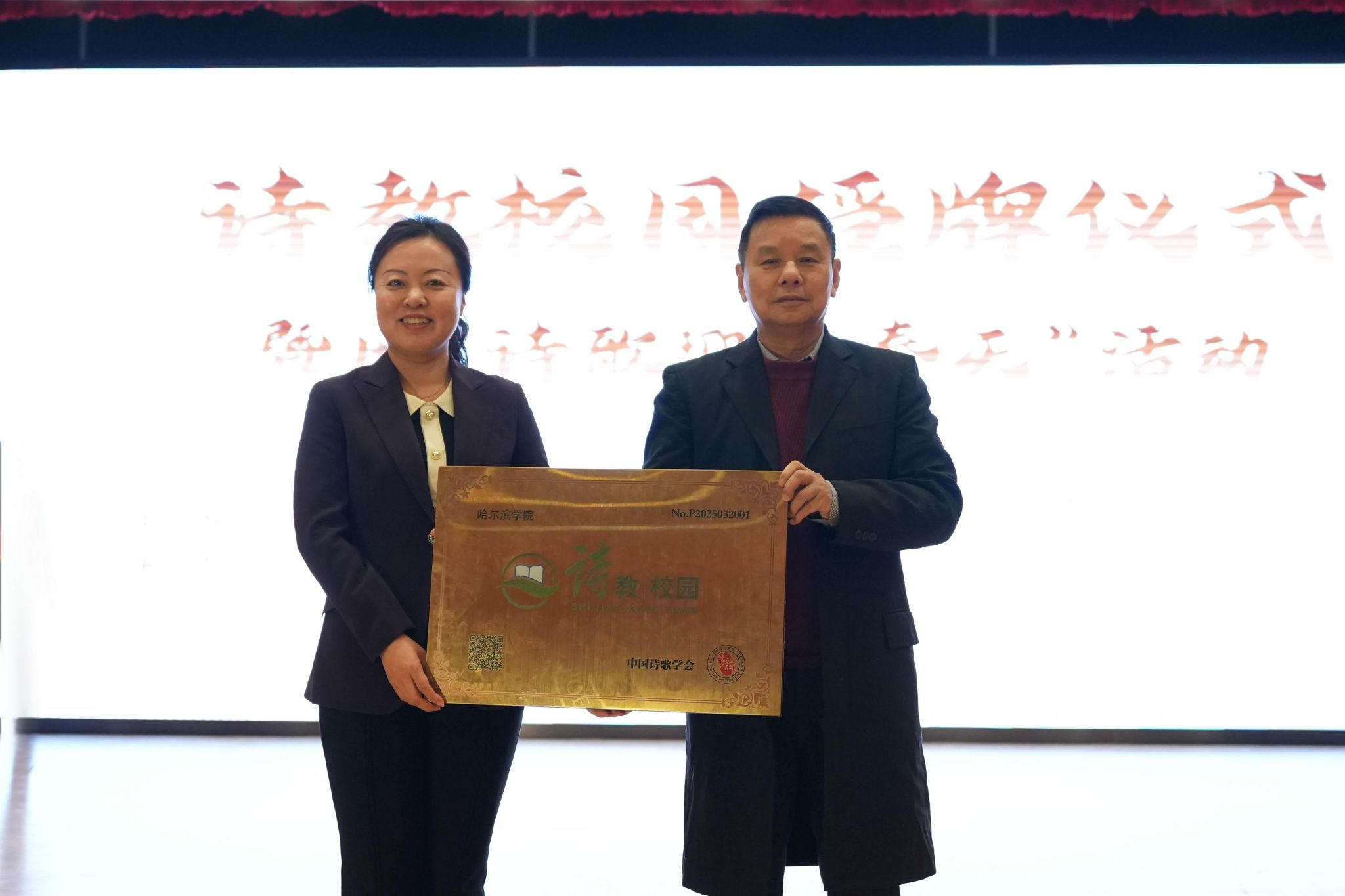 作为活动的重要成果,哈尔滨学院被授予“诗教校园”称号,校党委副书记李娜接牌并致辞。这一称号是对学院在诗歌教育领域卓越贡献的充分肯定。近年来,哈尔滨学院以“培养应用人才,成就城市未来”为使命,依托文法学院学科优势,开设诗歌创作课程、开展了一系列以“冰雪文化”为主题的省市群众性文化活动,邀请了王蒙、梁晓声、王立平等一批著名文学家、作曲家来校做客讲学,构建起“诗歌+教育”的特色育人体系,将诗歌创作与文化传承融入人才培养体系。
