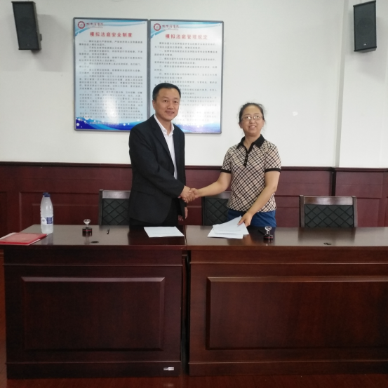 2018年6月27日下午,哈尔滨学院与黑龙江孟繁旭律师事务所签订校企合作协议,哈尔滨学院文法学院何颖副院长为鞠文英律师颁发聘书。