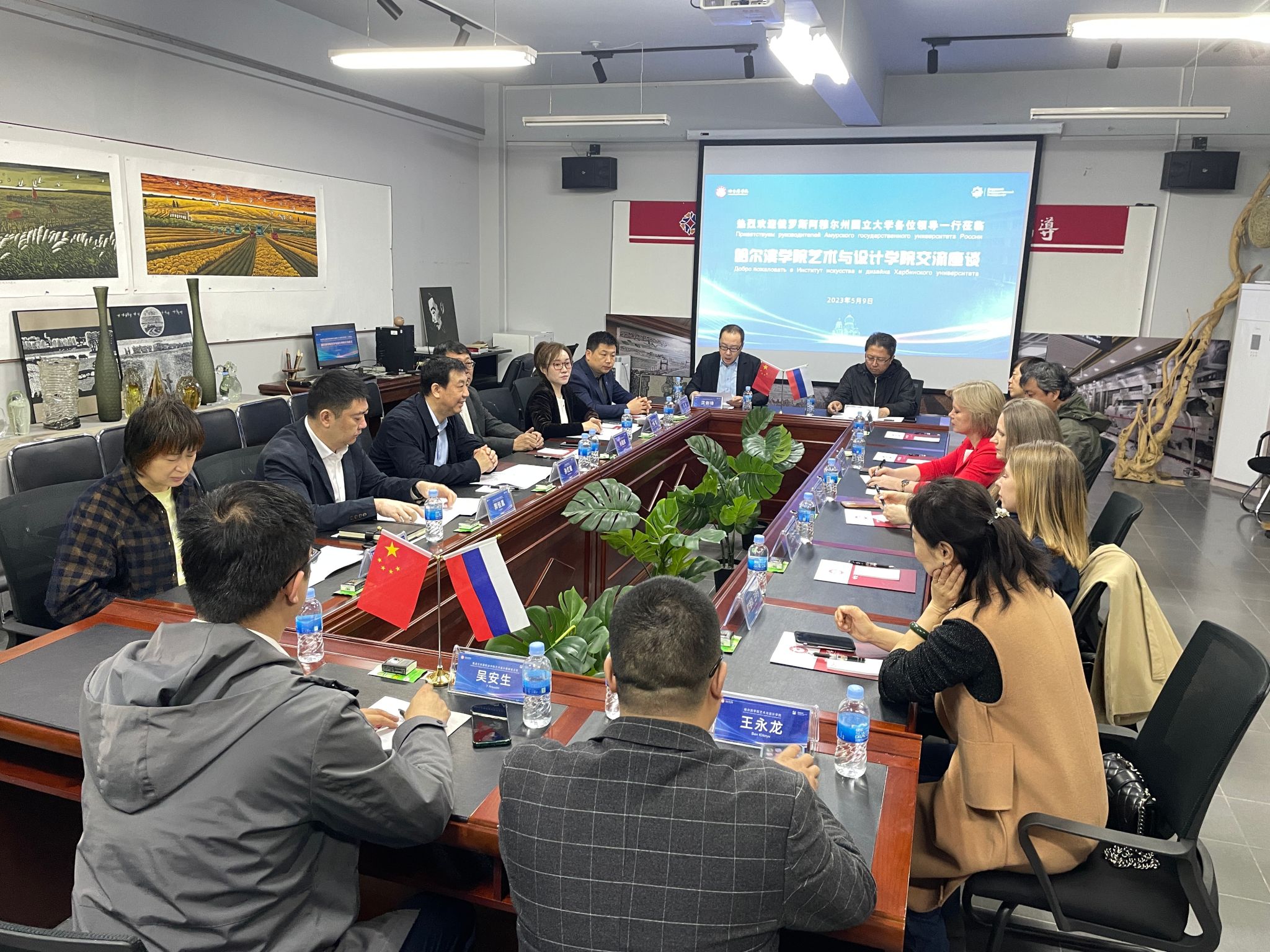 (文/沈剑锋)5月9日上午,俄罗斯阿穆尔国立大学副校长罗伊巴·娜塔莉亚女士一行到访我校进行合作洽谈。副校长孙红镱在艺术实验中心409会议室会见了代表团,艺术与设计学院党委书记孙国辉、党政办公室副主任郭佳胤、艺术与设计学院副处级辅导员郭鹏程、黑龙江省电视台国际部王涛及相关人员参加了会议。会议由外事办主任沈剑锋主持。