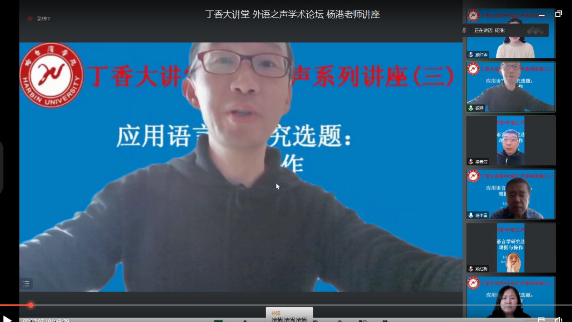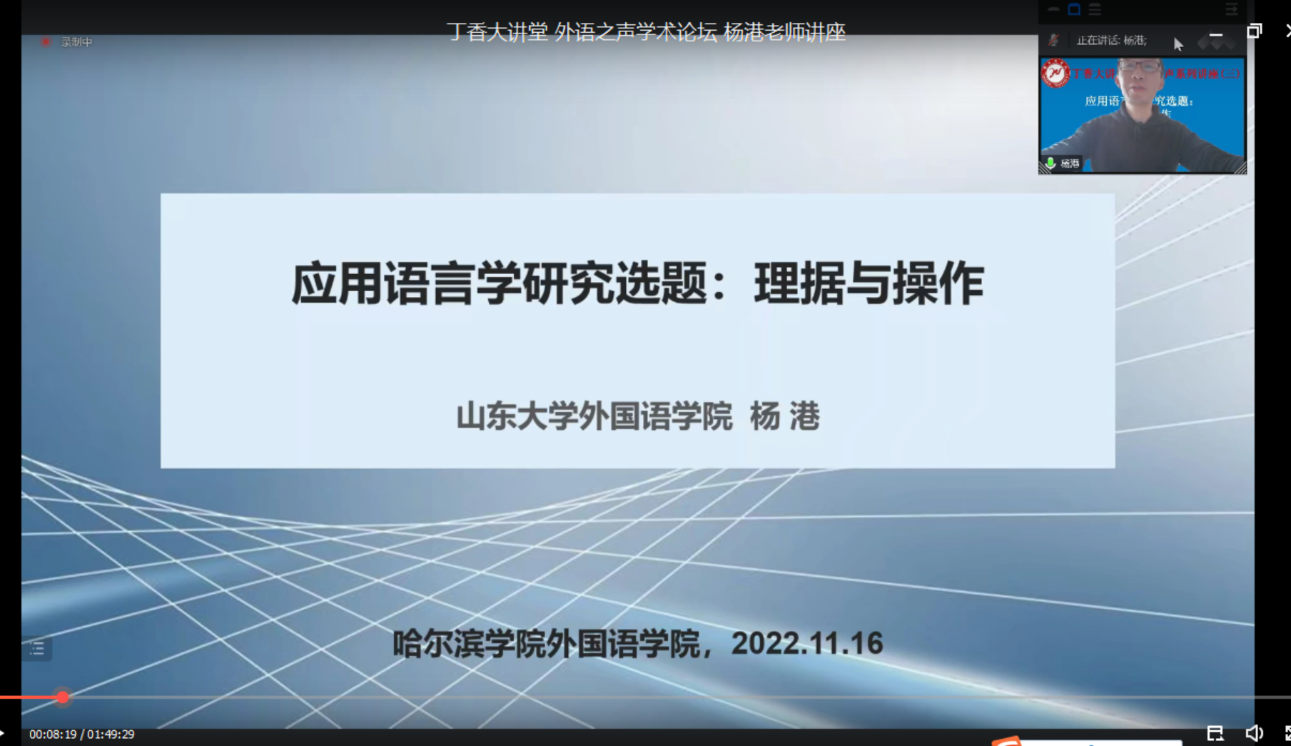 为进一步助力教师拓宽外语教学学术研究思路,提炼基于教学实践的研究选题,开展不同层次的课题申报及论文创作,11月16日下午,在科技处指导下,外国语学院成功举办了丁香大讲堂学术报告,暨“外语之声”系列讲座第三讲。报告人为上海外国语大学博士、山东大学博士后、国家社科基金项目主持人、山东大学外国语学院杨港副教授,报告题目为应用语言学研究选题:理据与操作。外国语学院全体专任教师参加了此次学术活动。