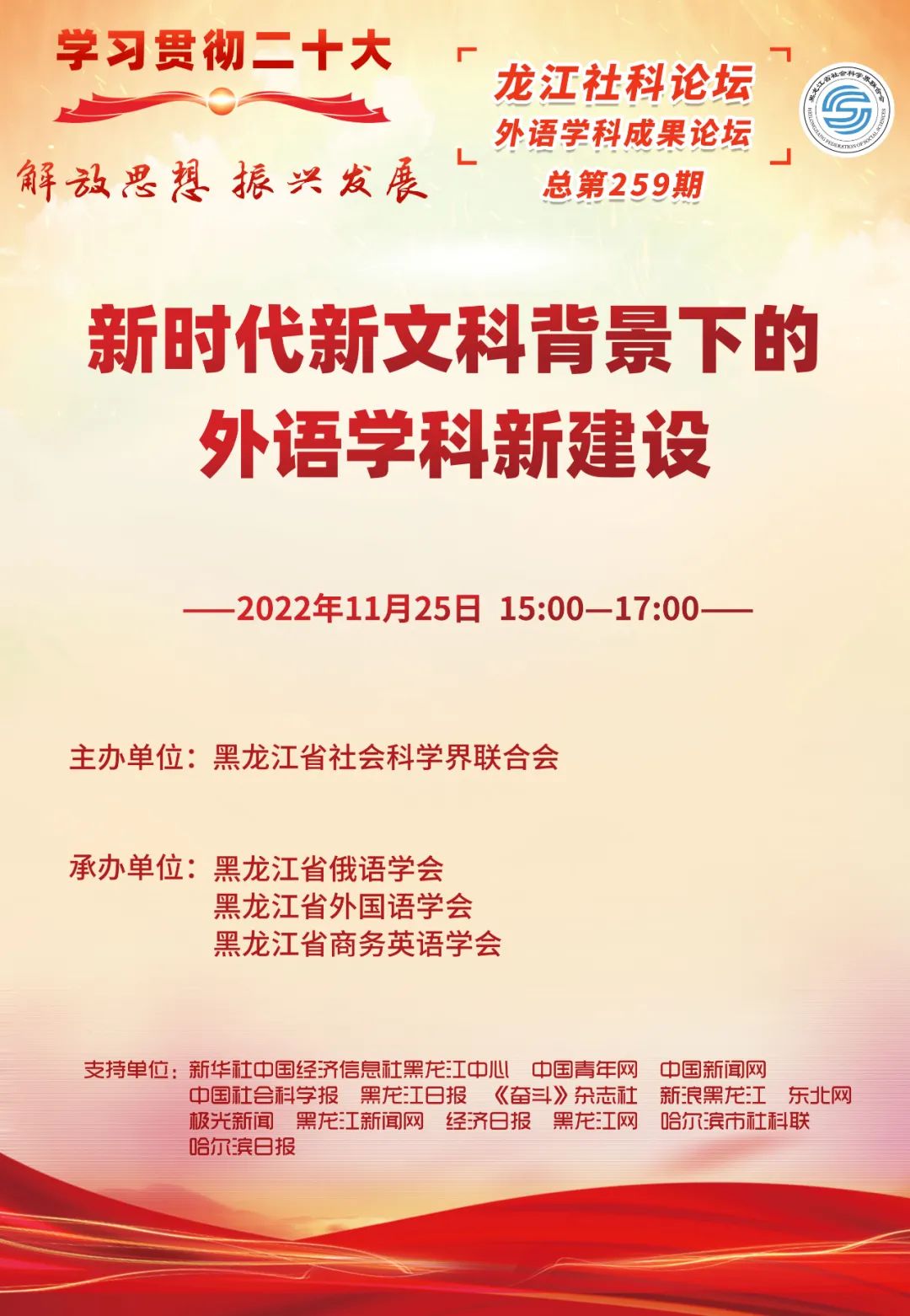 为了学习贯彻二十大“解放思想,振兴发展”的主题精神,黑龙江省社会科学界联合会于2022年11月25日成功线上举办了主题为“新时代新文科背景下的外语学科新建设”的龙江社科论坛 。