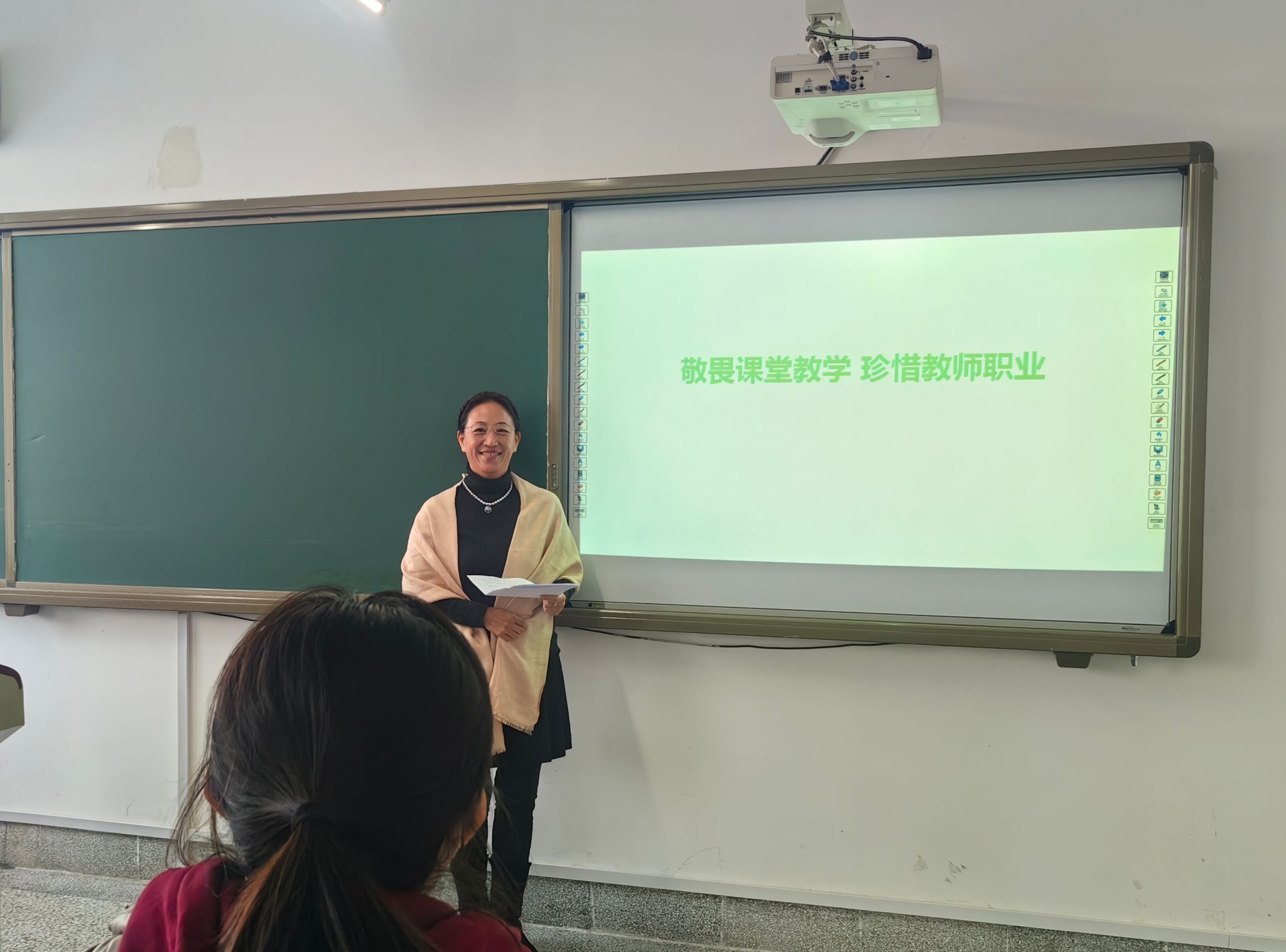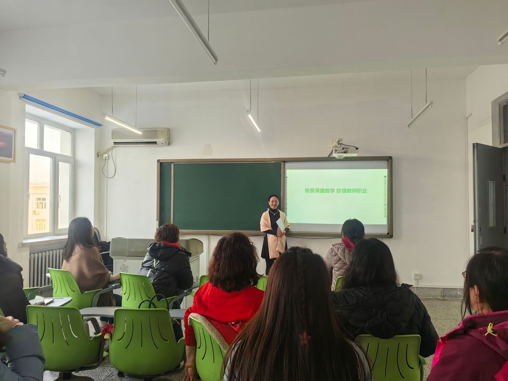 教师只有对自己的职业怀有敬畏之心才能钻研业务、精益求精、不断上进;才能热爱学生、关心学生、对学生负责;才能有正确的社会心态,正确对待得失、名利、辩证对待市场经济条件下教师这个职业定位。敬畏道德、敬畏课堂、敬畏职业、敬畏知识、敬畏生命。讲座即将结束的时候,王老师说我们既然选择了远方,便只顾风雨兼程,既然选择了教师这个职业,便要心无旁骛的做到更好。最后,王老师用“敬畏课堂教学,珍惜教师职业”这句话与大家共勉!结束了本次讲座。