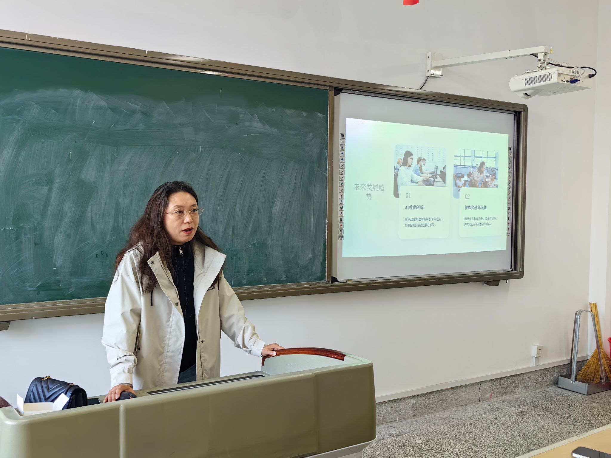 为庆祝学校九十周年华诞, 2024年10月9日下午1:00,大学英语教研部全体教师相会在1号楼1522教室,共同聆听由李墅钰老师主讲的“外语之声”学术论坛系列讲座(第29讲),讲座主题是“AI赋能教育和外语教育”。